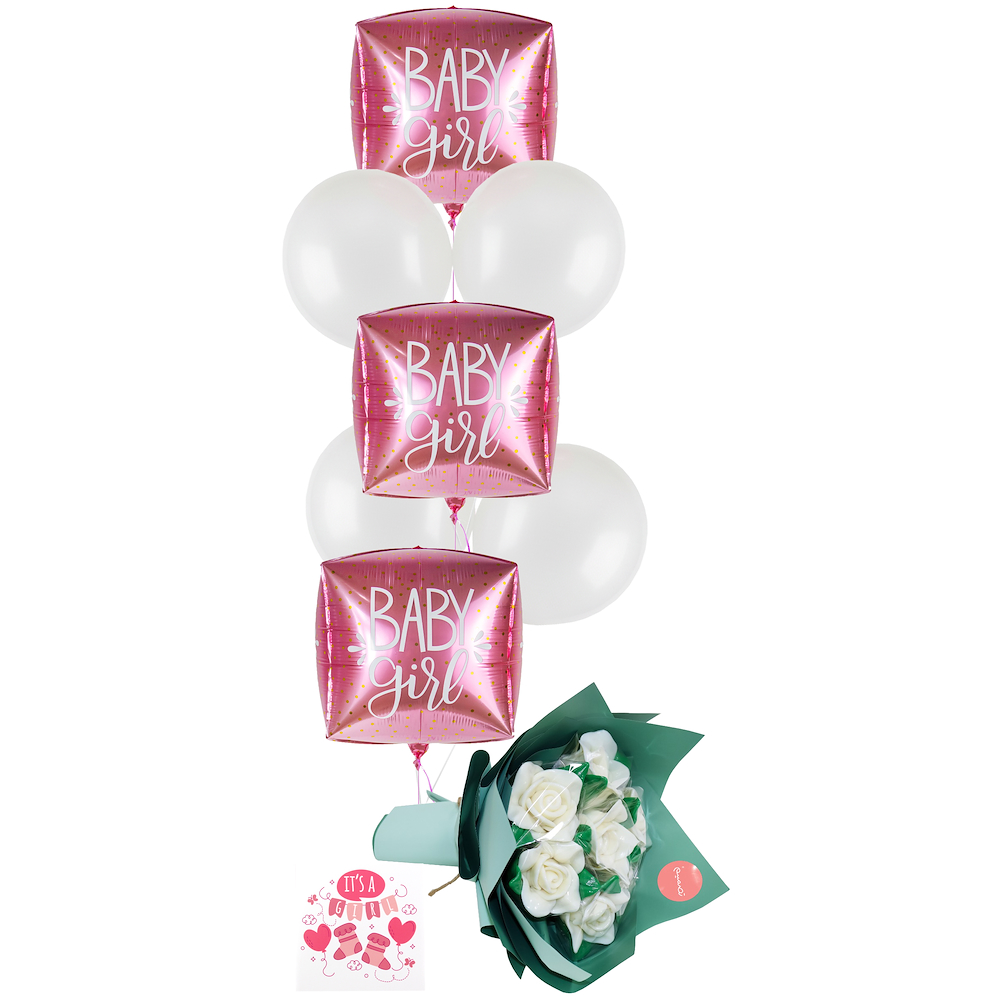 A delightful gift set featuring a colorful lollipop bouquet, a heartfelt greeting card, and cheerful balloons, perfect for celebrating the joy of a new baby with sweetness, love, and fun.