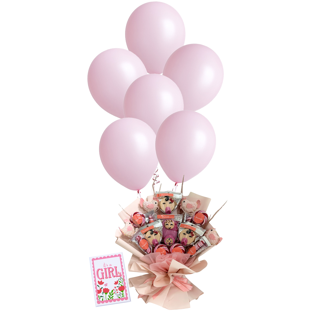 A delightful gift set featuring a colorful lollipop bouquet, a heartfelt greeting card, and cheerful balloons, perfect for celebrating the joy of a new baby with sweetness, love, and fun.