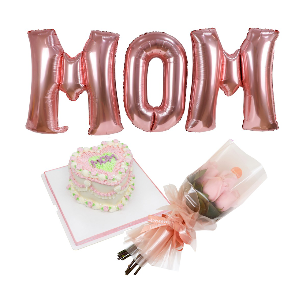A combo of mom balloon, cake, flower and bouquet.