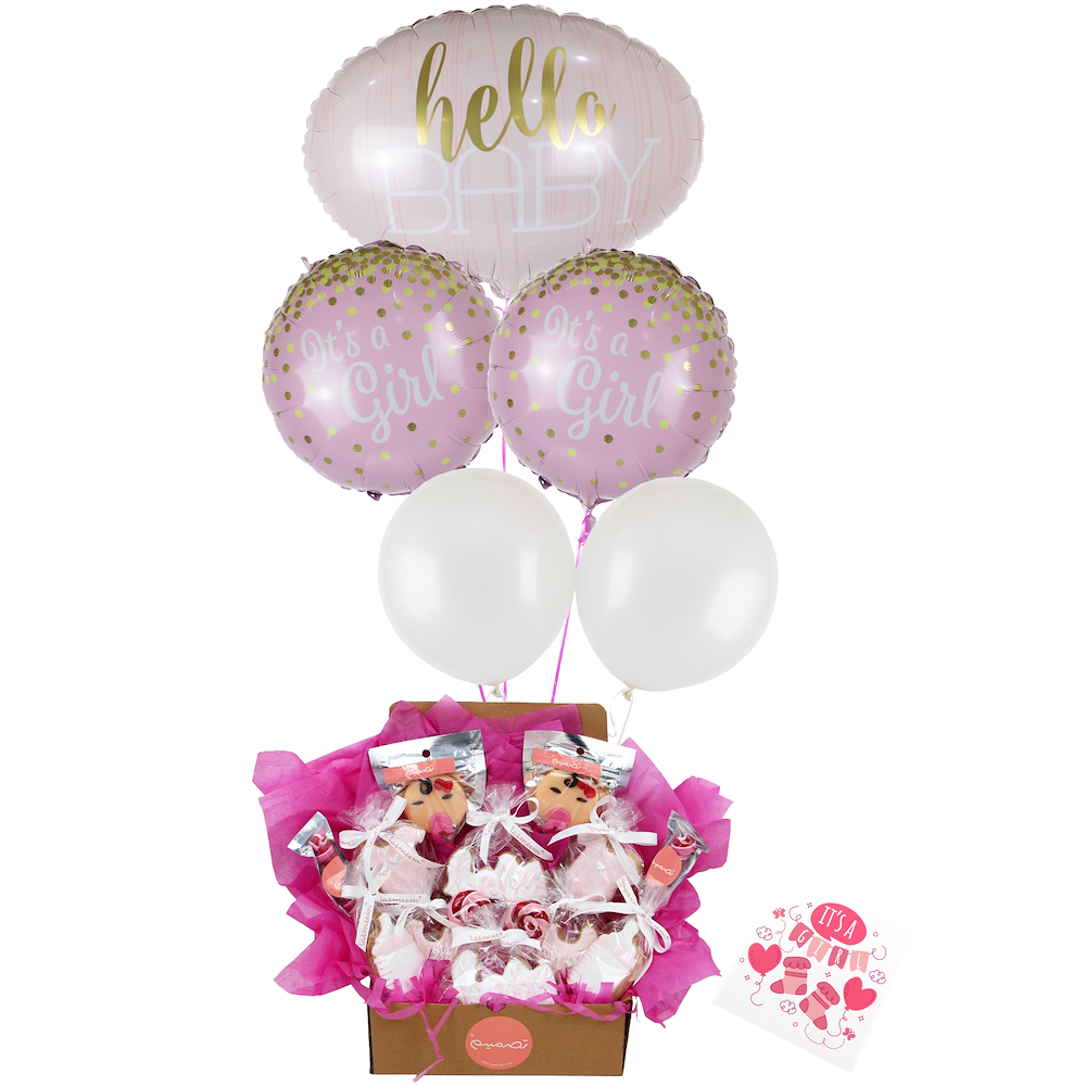 A joyful gift set with a charming gift box, a sweet greeting card, and colorful balloons, perfect for celebrating the arrival of a precious baby with love and cheer.