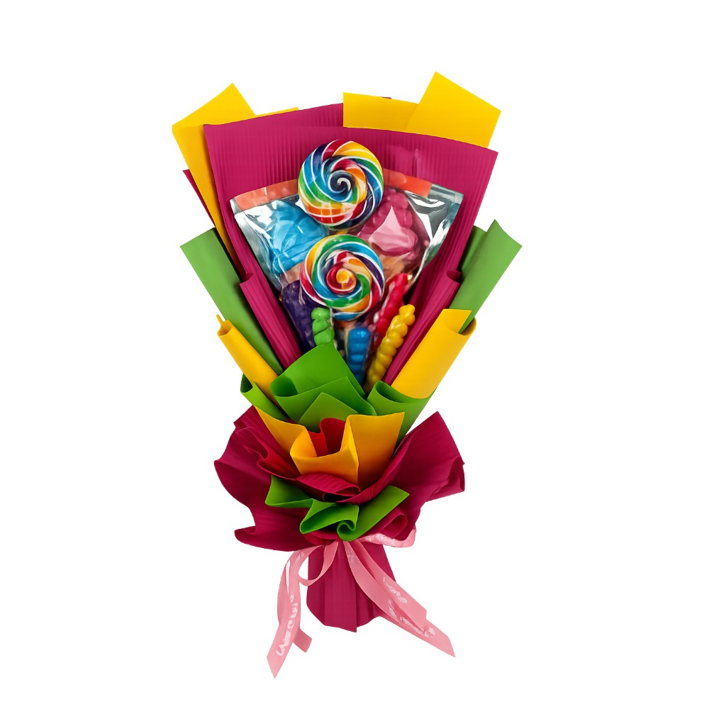 A festive candy bouquet featuring rainbow lollipops, colorful lollipops and ice cream-shaped lollipop wrapped in vibrant paper and tied with a cheerful ribbon.