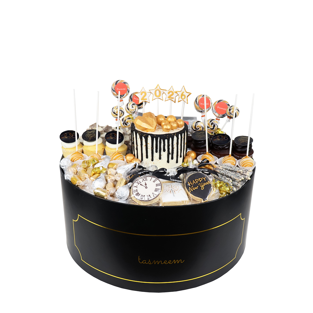 A snack box contains cake, cupcakes, cookies, chocolates, lollipops, and accessories.