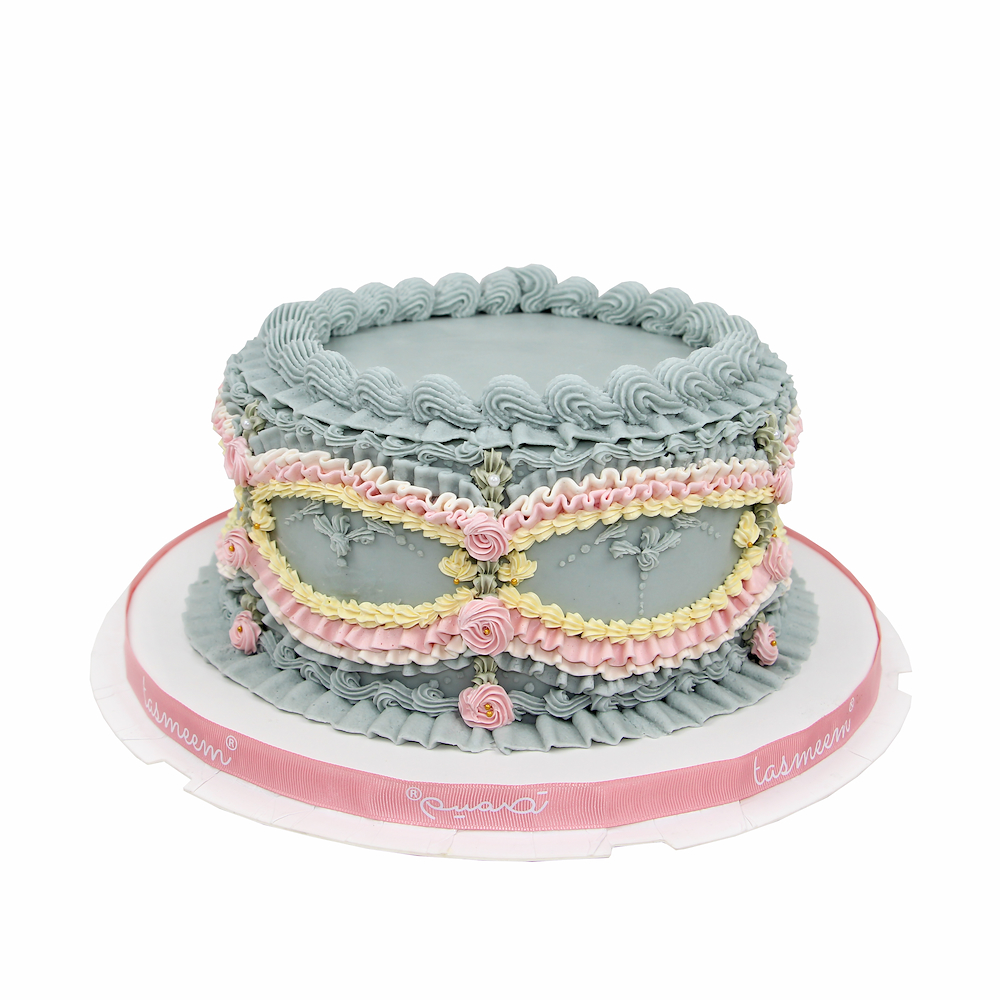 A graceful pink heart cake adorned with swans and Arabic love script, perfect for romantic celebrations.