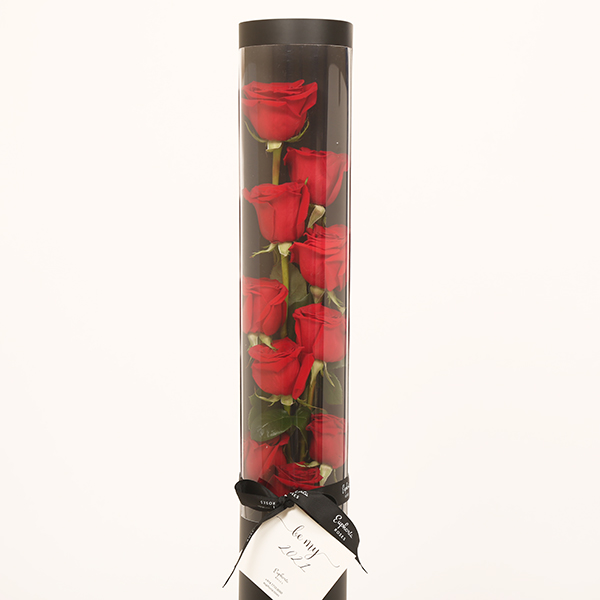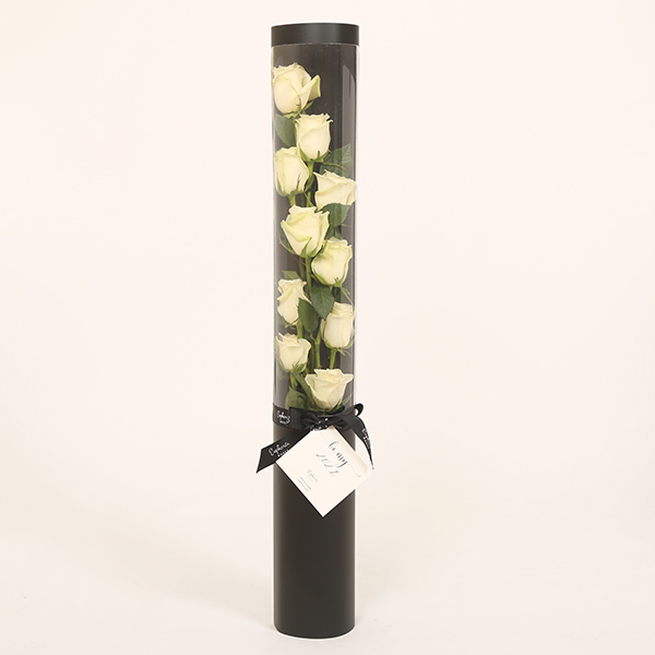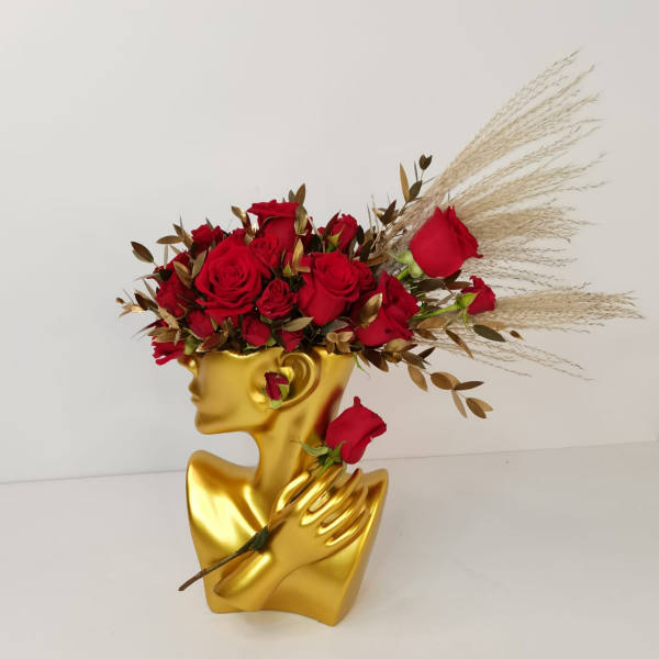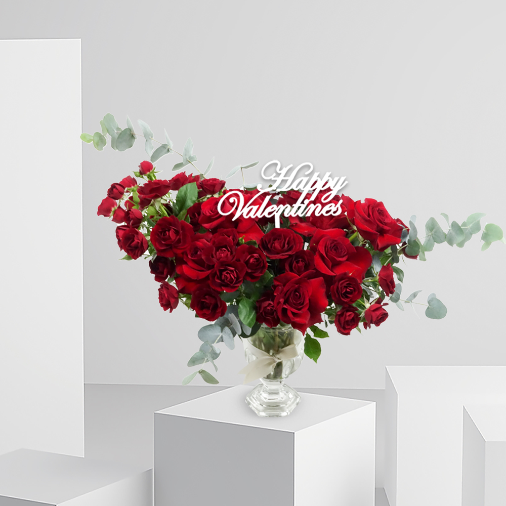 A bouquet containing roses, baby roses, and eustomas, elegantly presented in a chic white ceramic vase. It's a symphony of love's finest melodies.