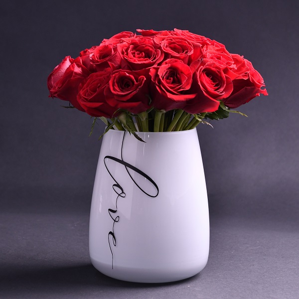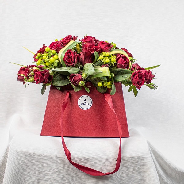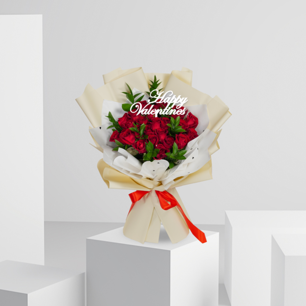 Capture hearts with this hand bouquet containing 25 radiant red roses and ruscus leaves, elegantly wrapped in heart-printed and cream paper. A romantic and charming arrangement, perfect for Love Day, anniversaries, or expressing your deepest affection.