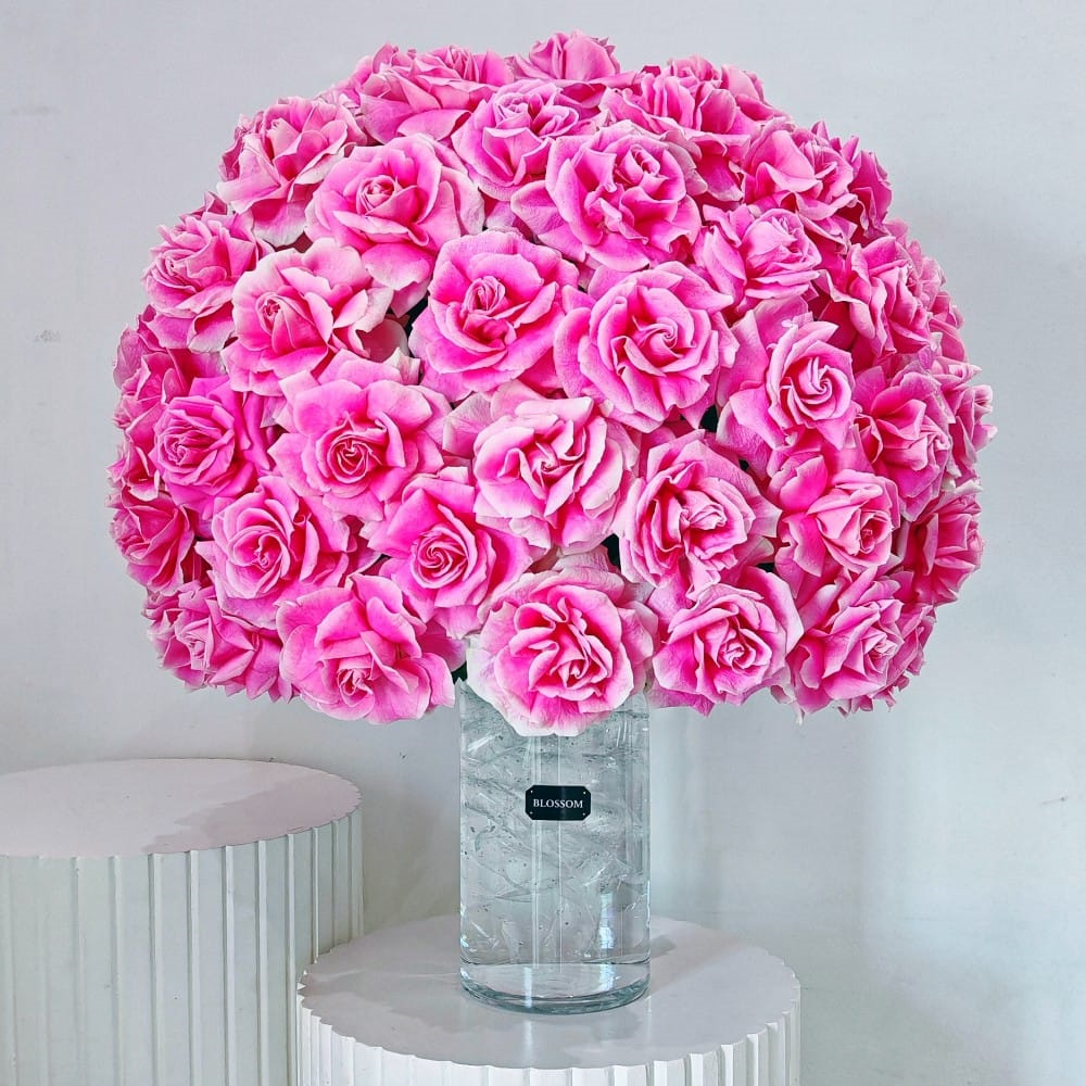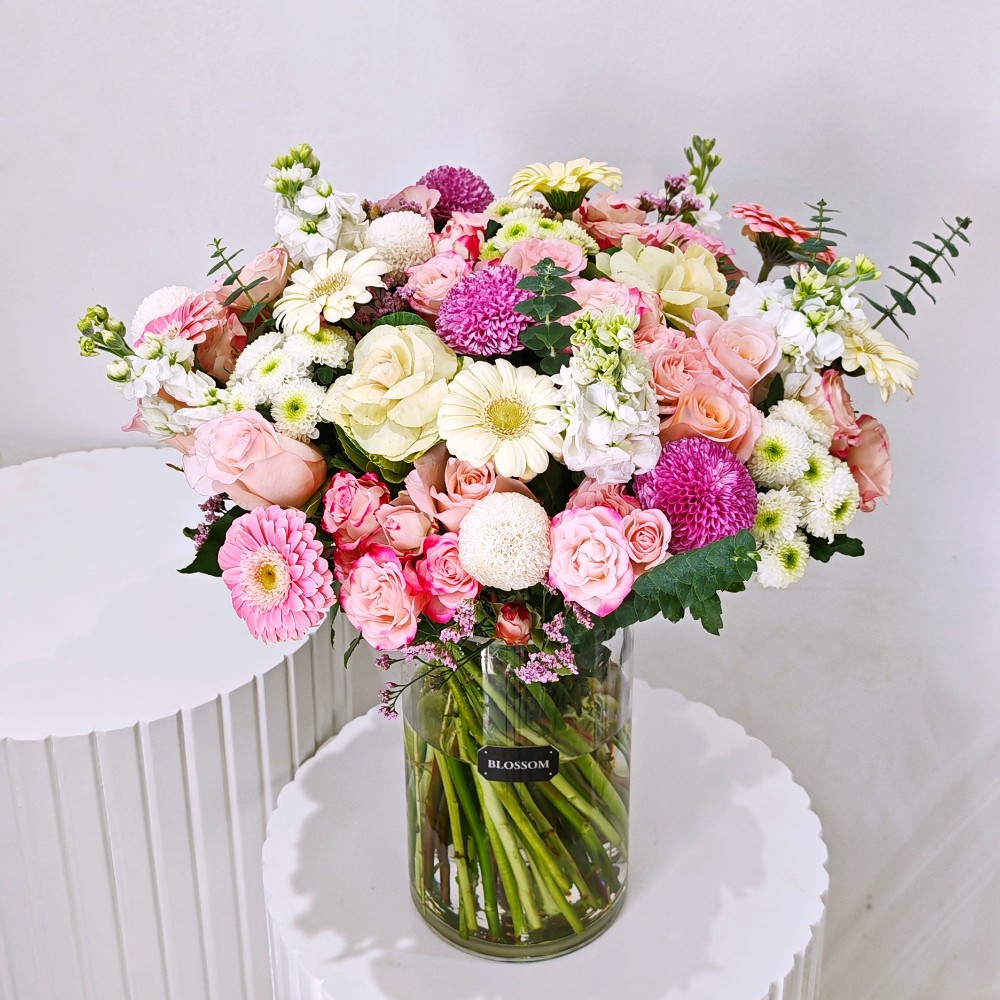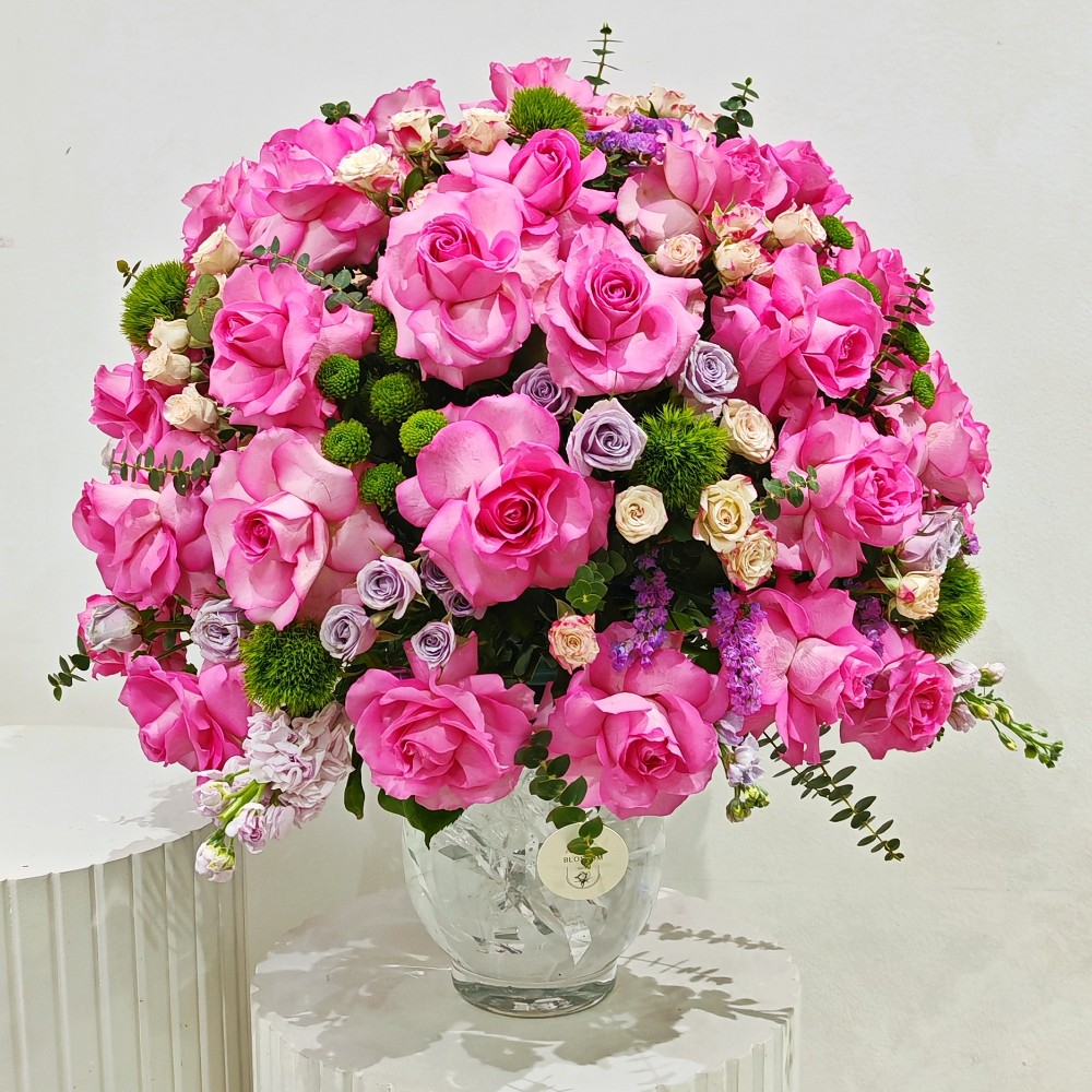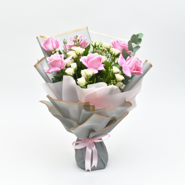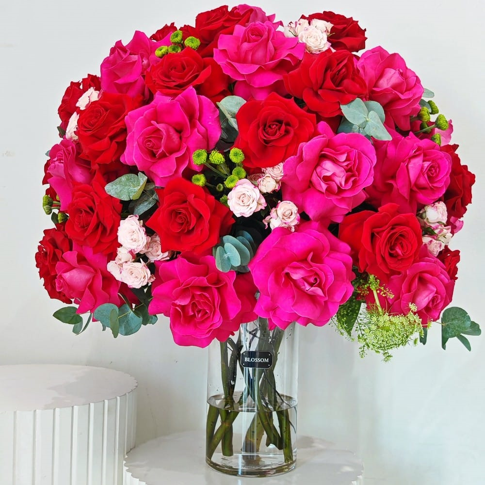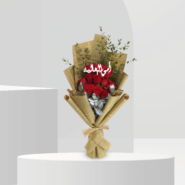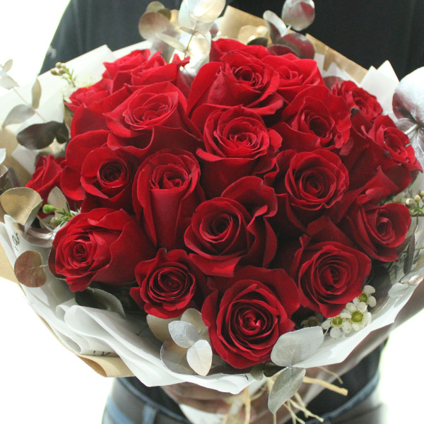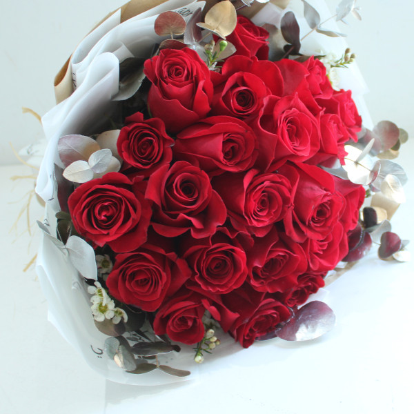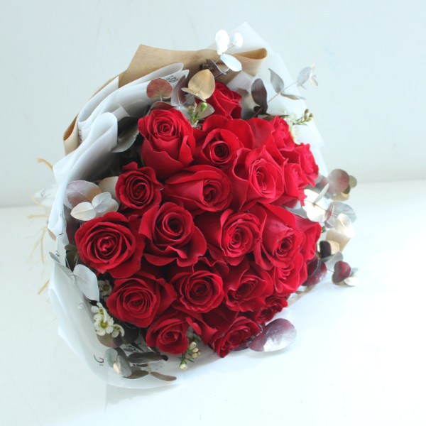 Two dozen red Roses wrapped with mother's day theme wrapper.