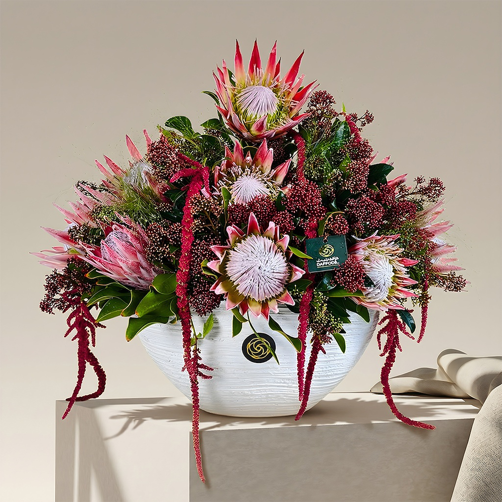 This bouquet contains protea, amaranthus, skimmia, ammi.