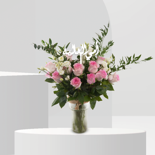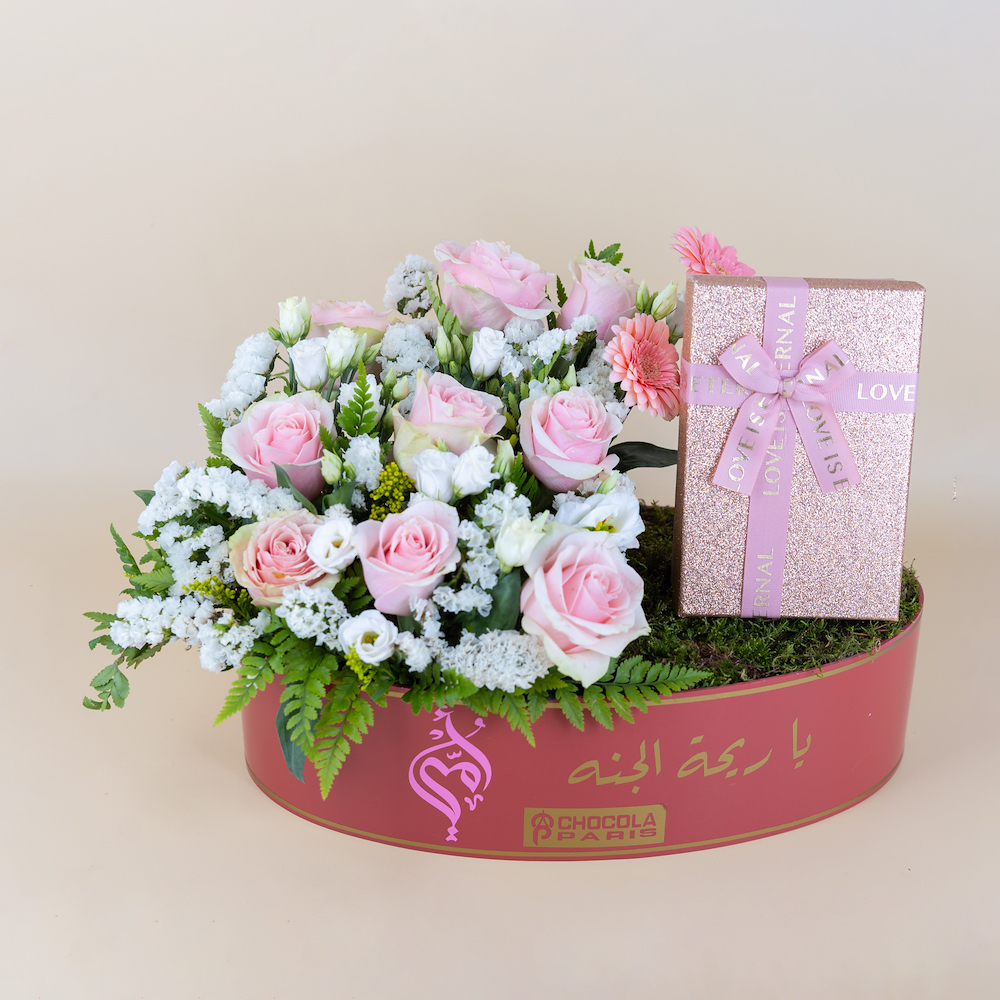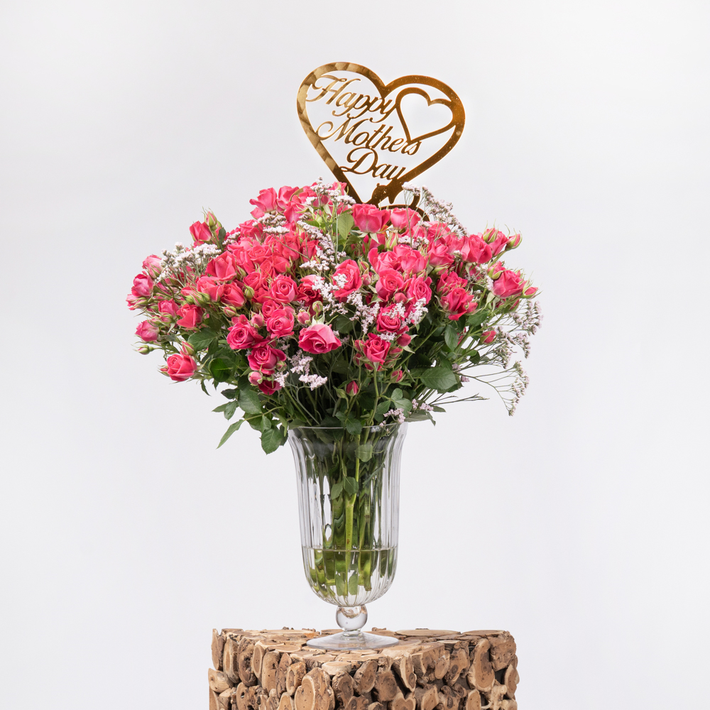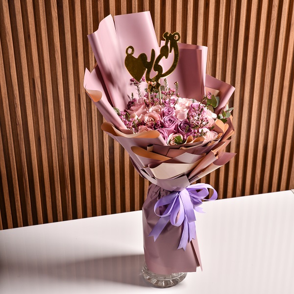 A sophisticated hand bouquet contains 30 roses flowers and a selection of dried flowers.