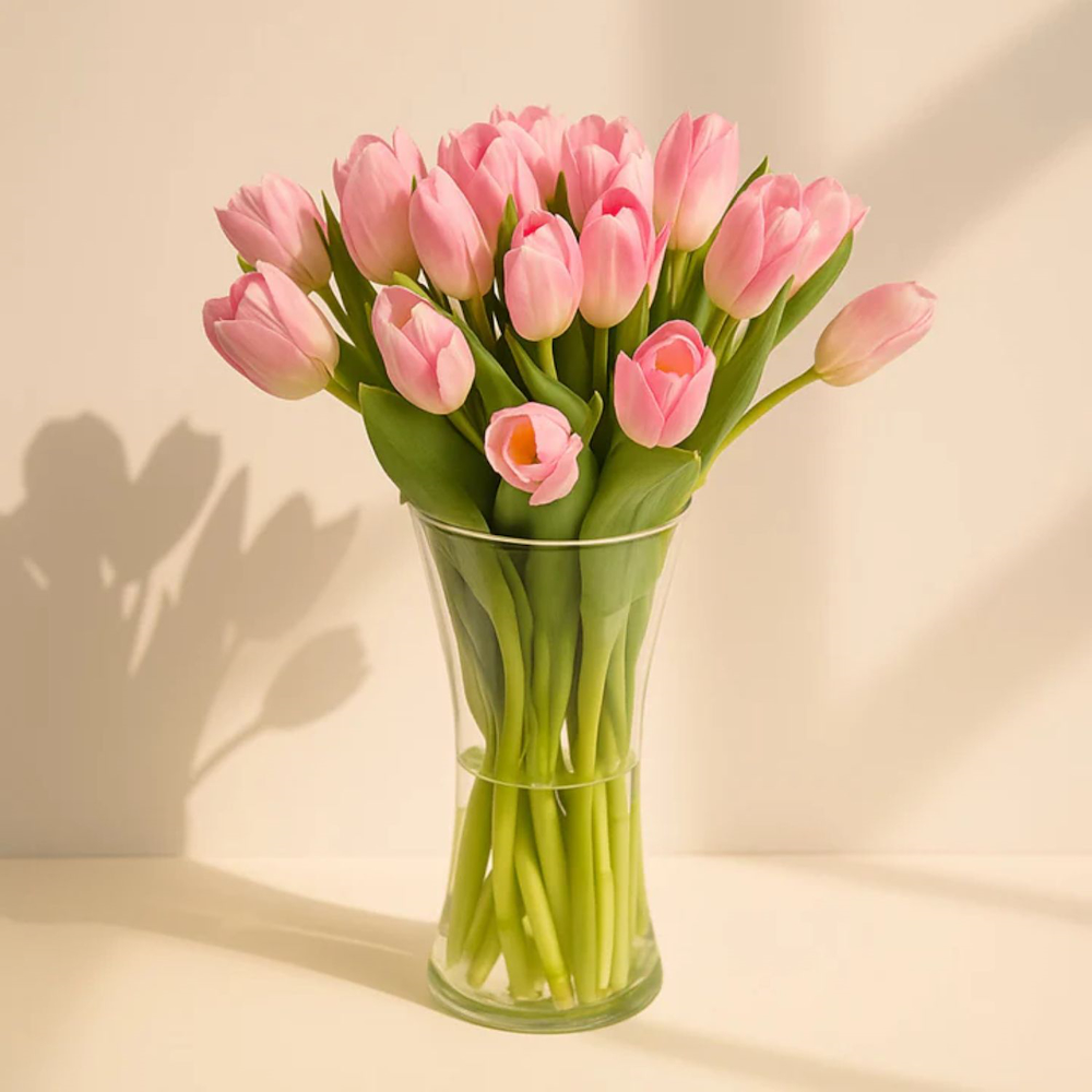 Experience the elegance and beauty of nature with our stunning arrangement of 18 pink tulips, gracefully displayed in a sleek glass vase. This exquisite floral piece is ideal for adding a touch of sophistication to any space, be it your home, office, or as a thoughtful gift for a loved one.