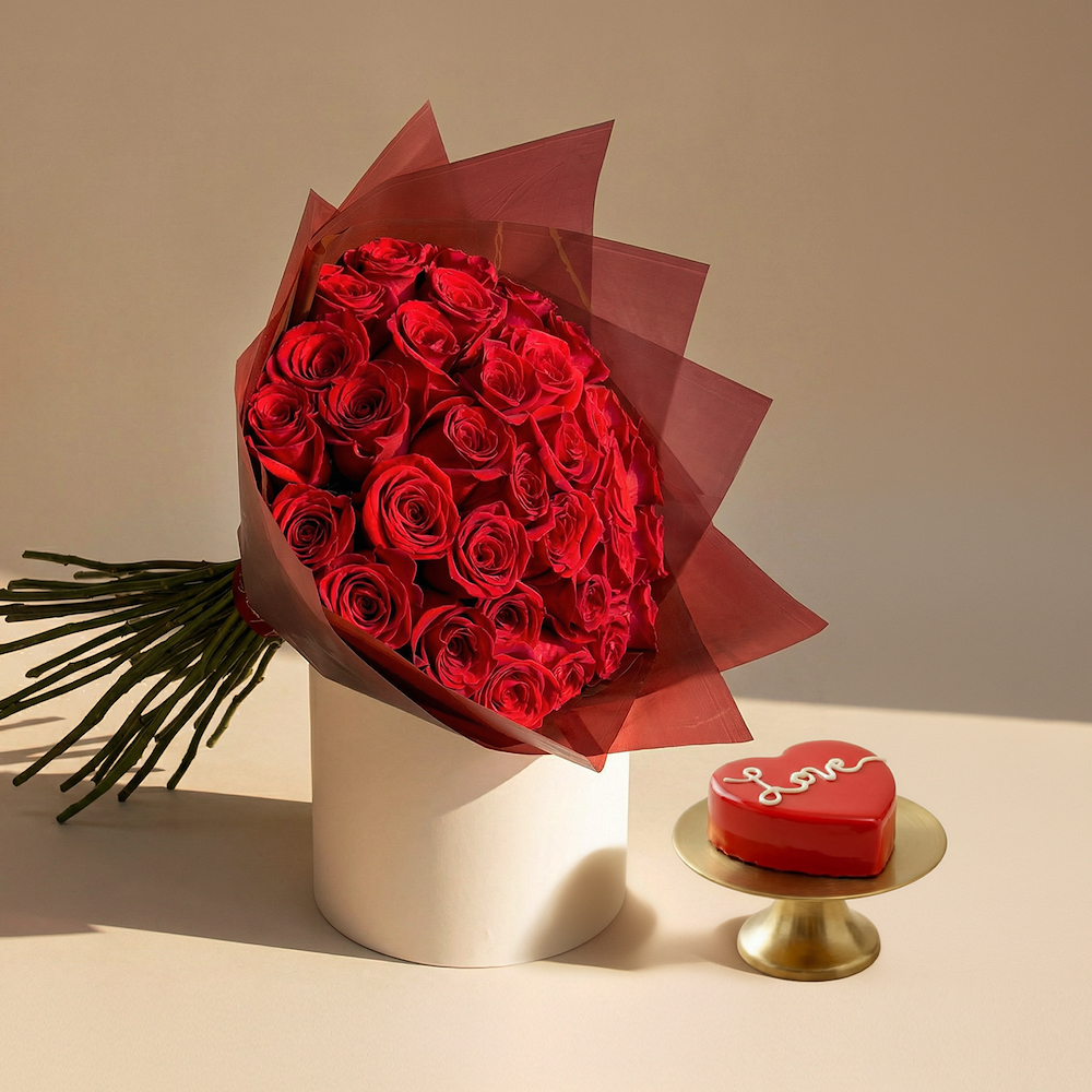 Surprise your loved ones with our bouquet, beautifully wrapped and accented with a luxurious ribbon. This exquisite arrangement is paired with a delightful, heart-shaped 200g red velvet cake, making it a perfect gift for any special occasion.