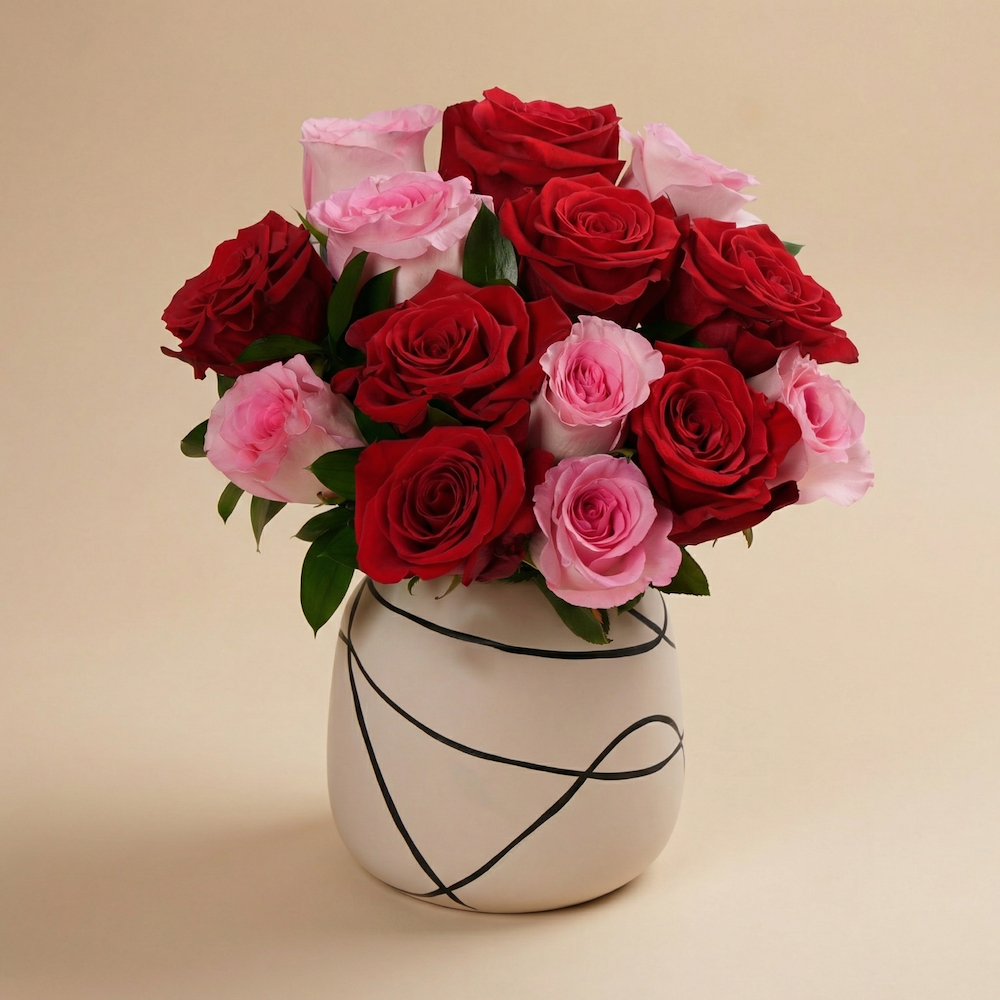 Celebrate love and elegance with a bouquet that contains 8 radiant red roses, 8 soft pink roses, and 10 lush ruscus stems. All expertly arranged in a stylish ceramic vase, perfect for any occasion.