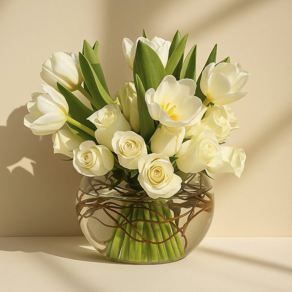 Contains 20 enchanting white roses. Includes 5 stunning white tulips. Accentuated with 2 salix sticks for added charm. Presented in a premium glass vase.