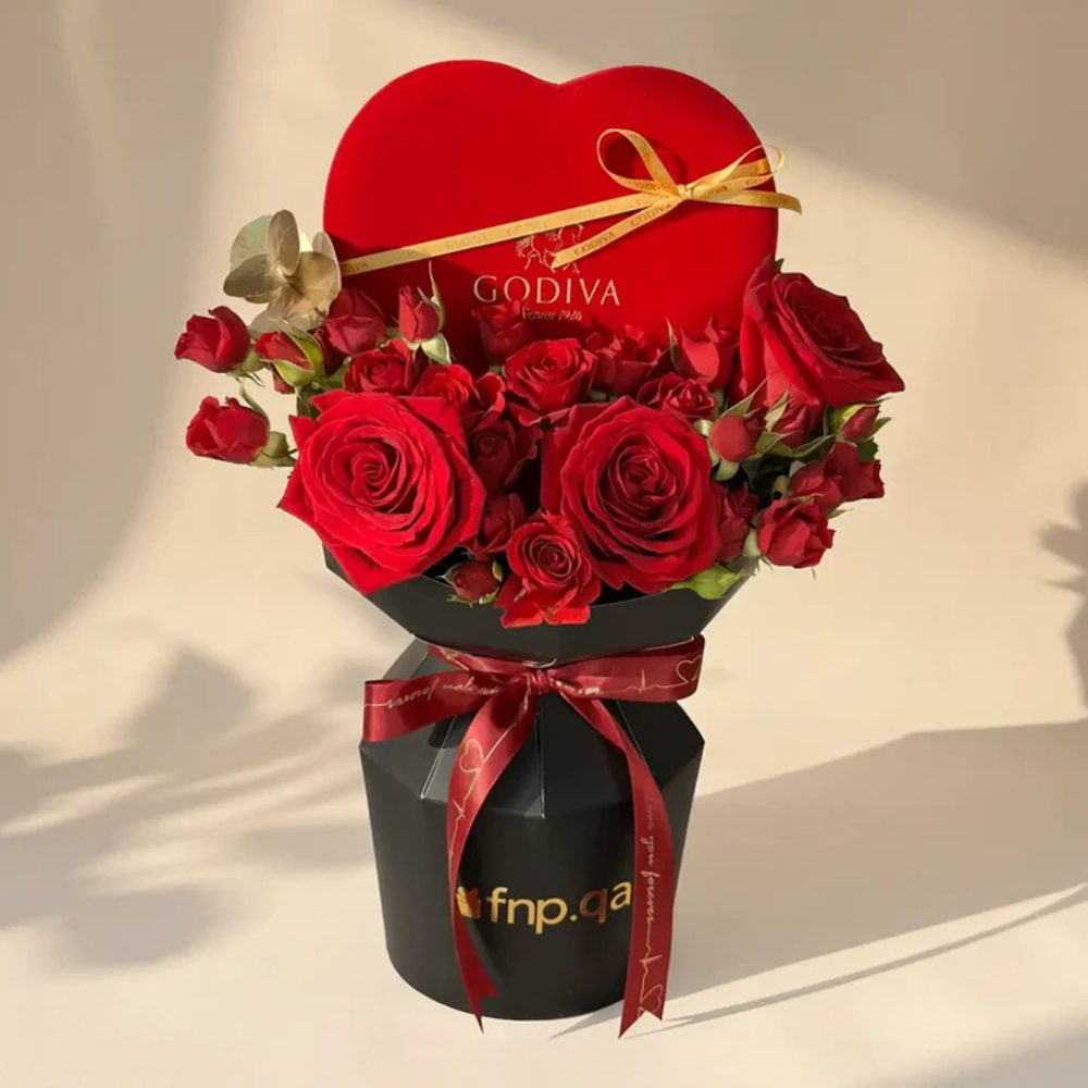 An elegant bouquet featuring roses and baby roses flowers with a Godiva red velvet heart box filled with 7 assorted Belgian chocolates.