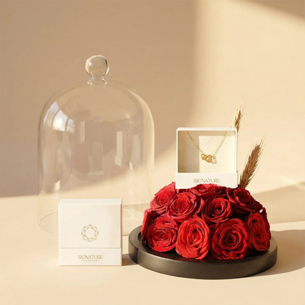 An elegant glass dome featuring 4 baby roses flowers and 3 dry leaves with a stainless steel necklace with a gold finish and double interlocking hearts.