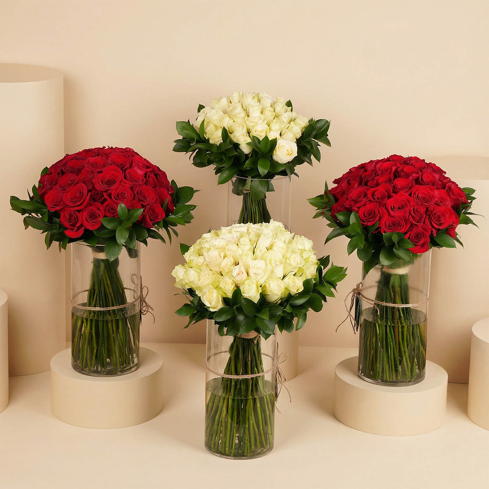 Celebrate profound love with this set that contains 80 red roses, 80 white roses, 20 ruscus leaves, and 4 elegant glass vases.