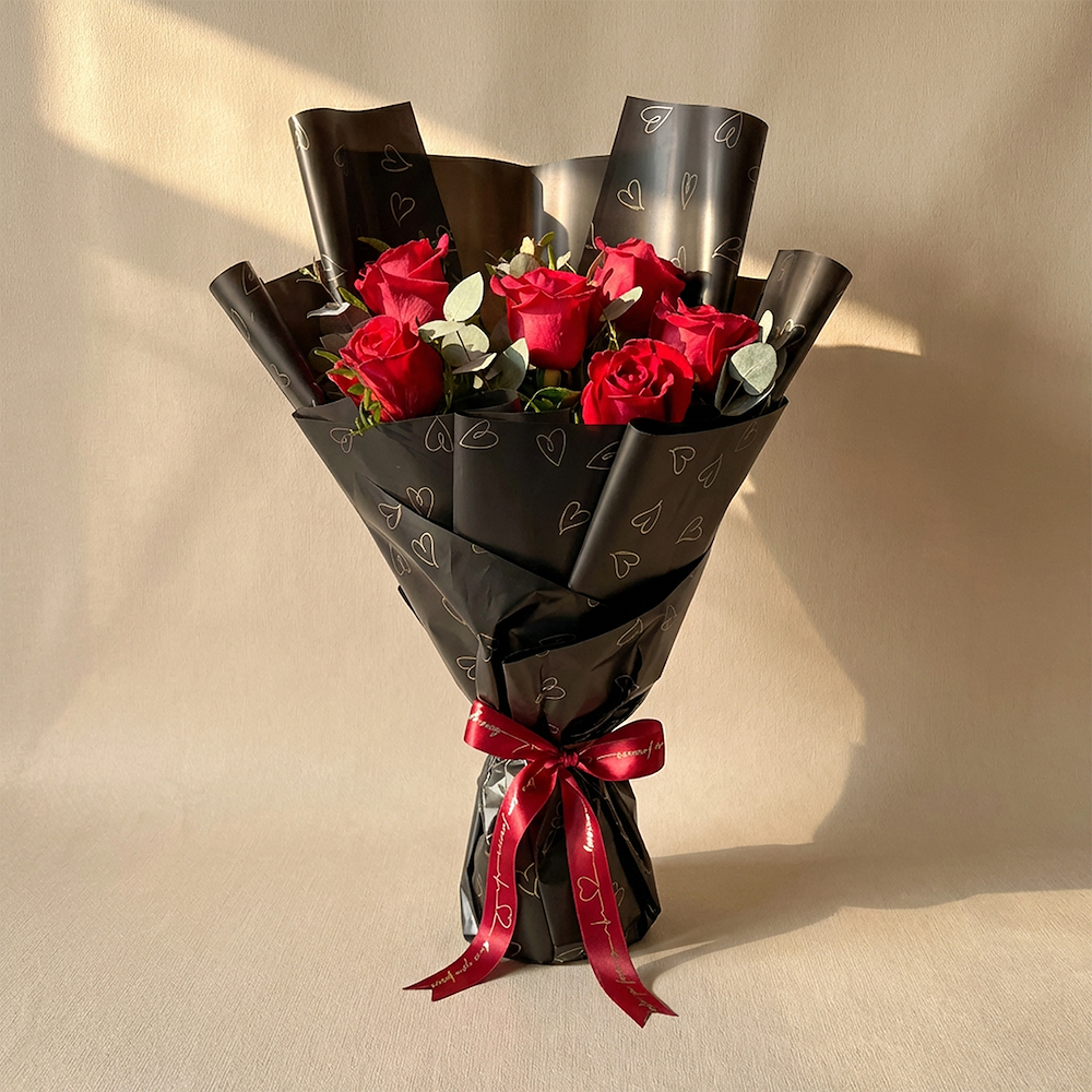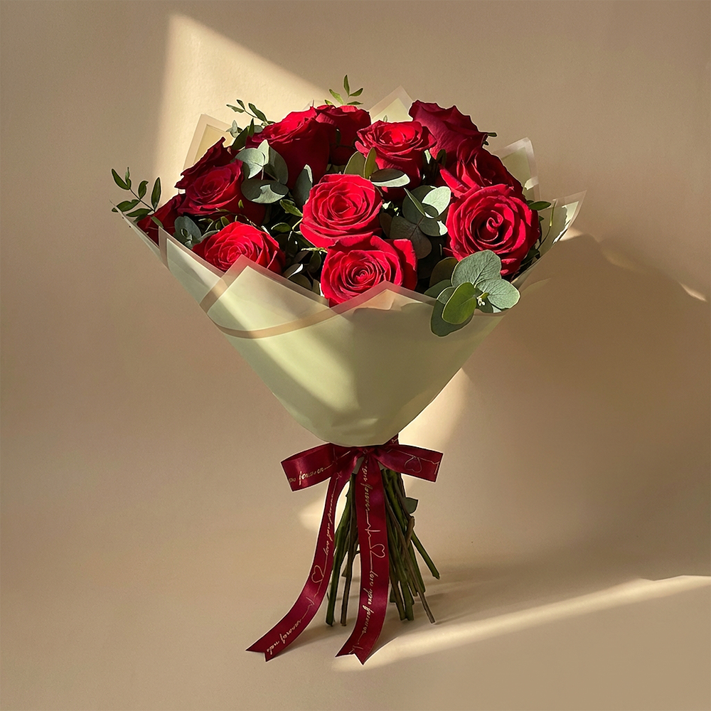 A glass vase filled with 5 light pink carnation, 5 light pink rose, 4 light pink spray rose, 2 white gypsophila, 3 pink statice and 2 cinerea eucalyptus.