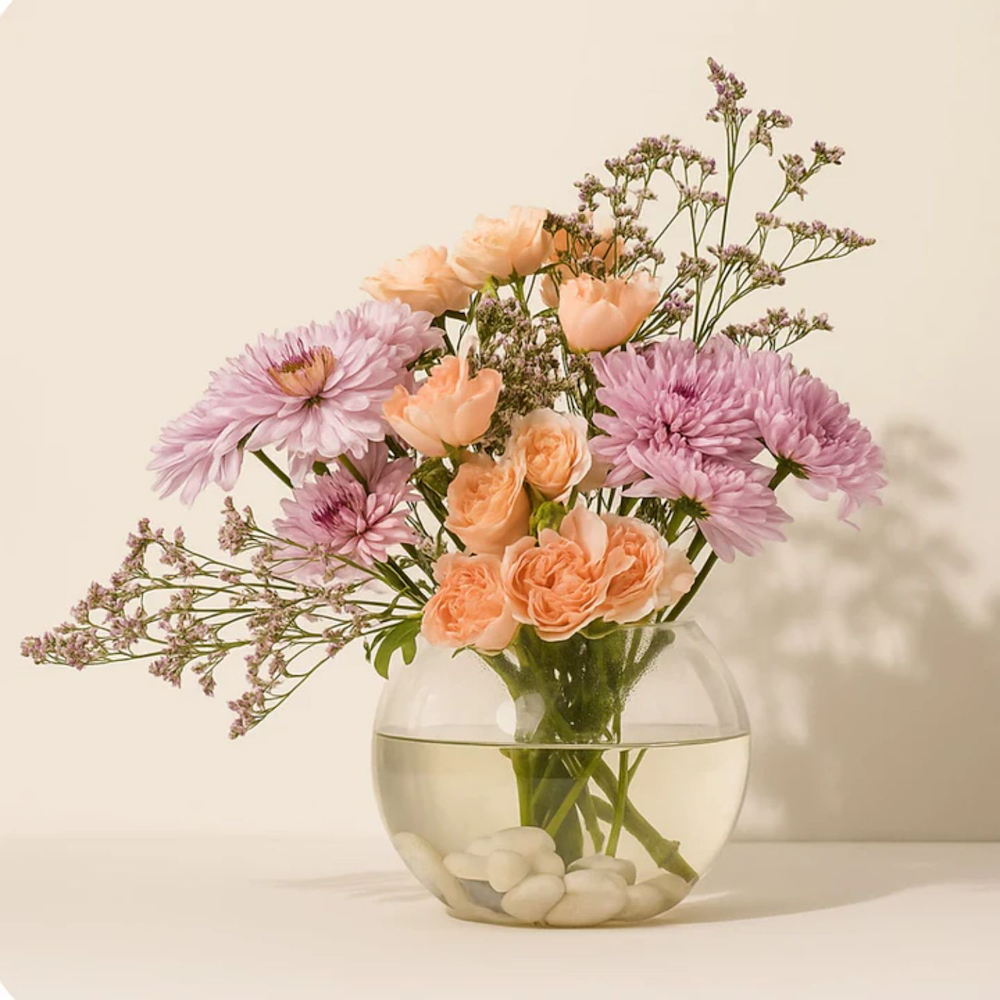 A floral arrangement containing 2 delicate baby roses that add a soft, romantic touch, 1 purple limonium stem for contrast and depth, and 2 pink chrysanthemums that bring vibrancy and cheerfulness to the bouquet.