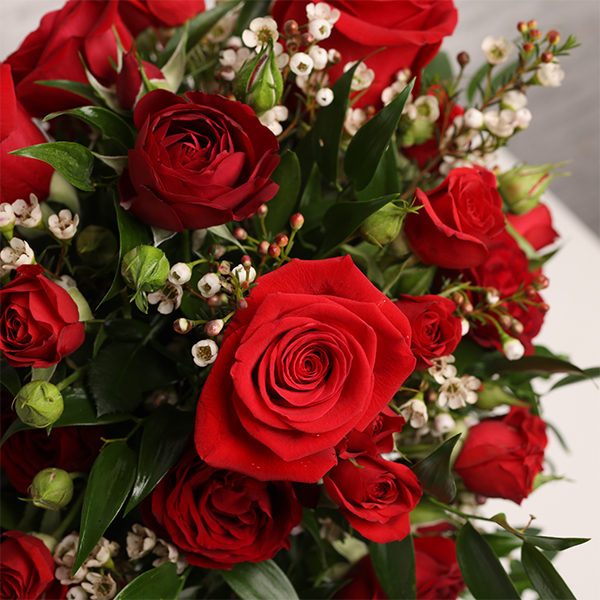 3 red roses, 3 stems of red spray roses, 2 stems of white wax flowers, fillers, arranged in a glass vase.
