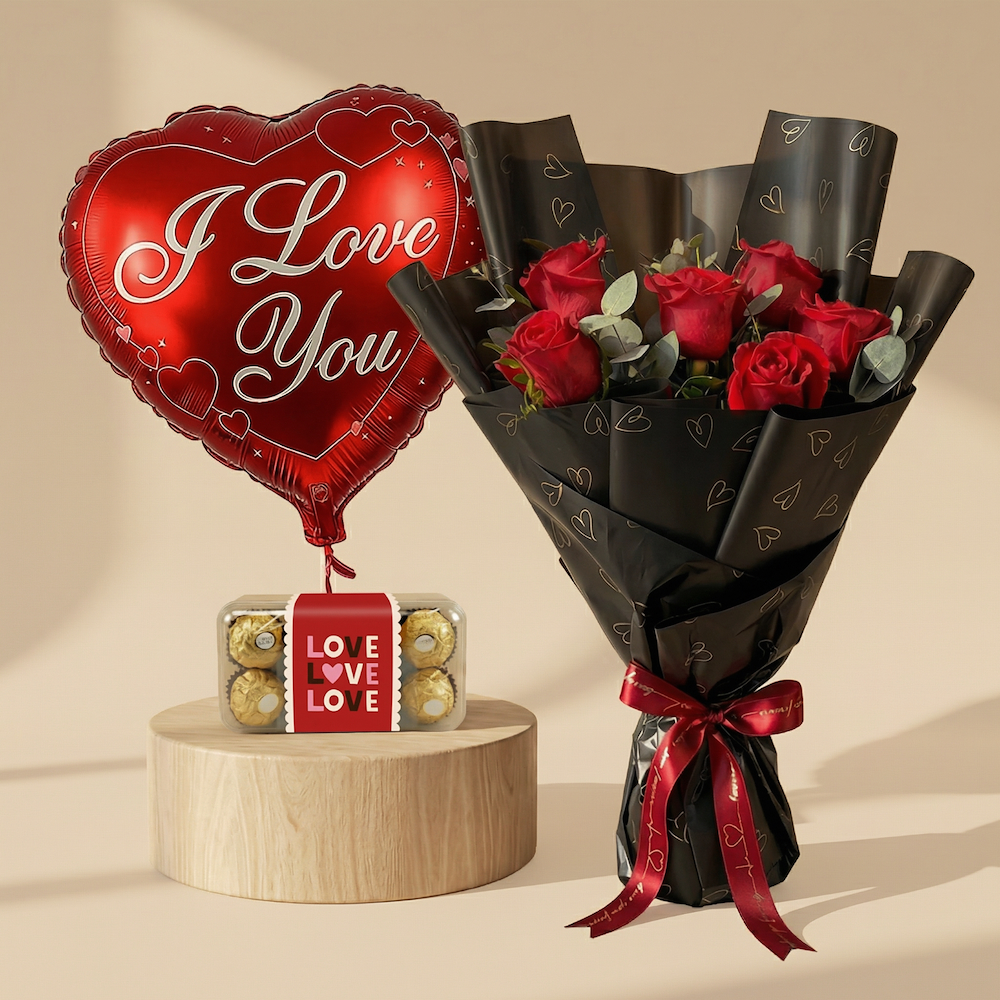 Express your heartfelt emotions with this combo. This exquisite gift set contains 6 vibrant red roses, 2 elegant pistachio leaves, 1 aromatic eucalyptus, a heart-shaped 'I Love You' balloon, and a Ferrero Rocher chocolate box with 16 delectable pieces. Perfect for making your loved one feel cherished and adored.