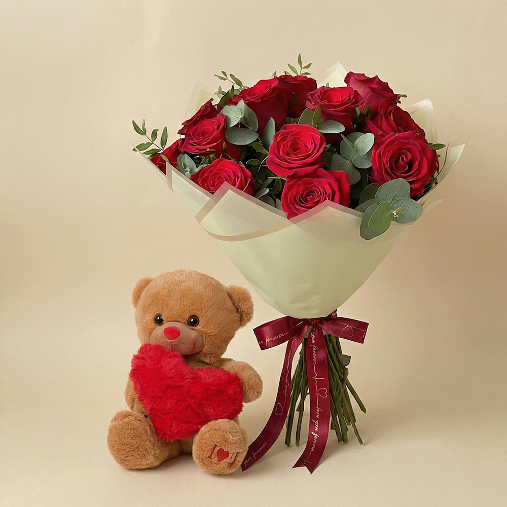 Express your love with this exquisite gift set, featuring a stunning bouquet of 12 red roses, elegantly paired with lush pistachio stems, and aromatic eucalyptus to make this gift even more special. We've included a charming brown teddy bear holding a heart, perfect for cuddles and conveying affection.