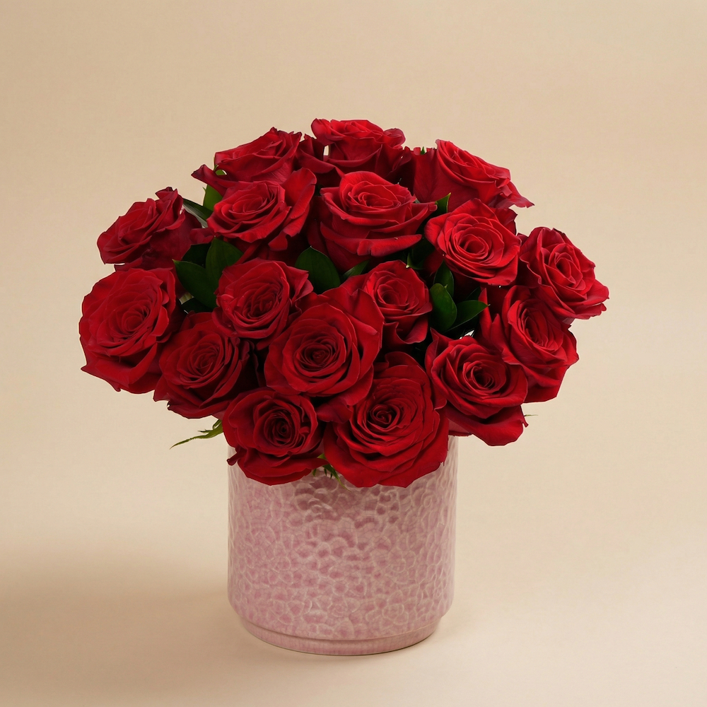 Express your deepest emotions with this bouquet that contains 18 vibrant red roses and 10 green ruscus stems, beautifully curated in a stylish ceramic vase. Perfect for any special occasion where love is the message.