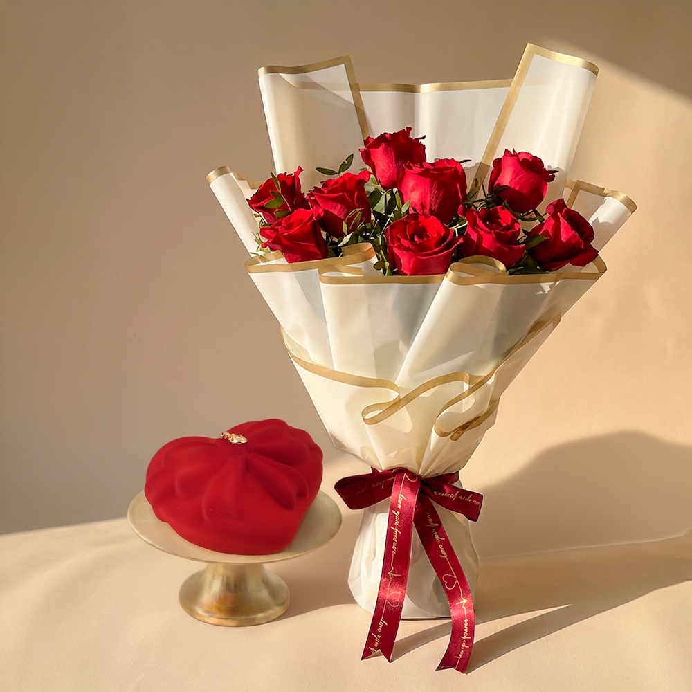 Celebrate special moments with our romantic set. This exquisite combo is perfect for expressing love and affection. 9 lush red roses, fresh and vibrant, elegantly wrapped in a beautiful wrapping sheet, 2 pistachio leaves, adding a touch of greenery to enhance the bouquet's beauty, a heart-shaped red velvet cake (400g), indulge in the rich, velvety texture of this delicious cake, crafted with love. Perfect for anniversaries, birthdays, or any occasion that deserves a touch of romance.