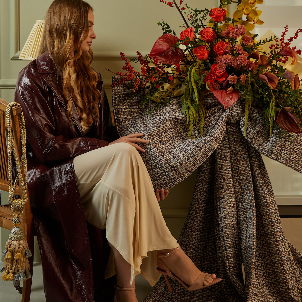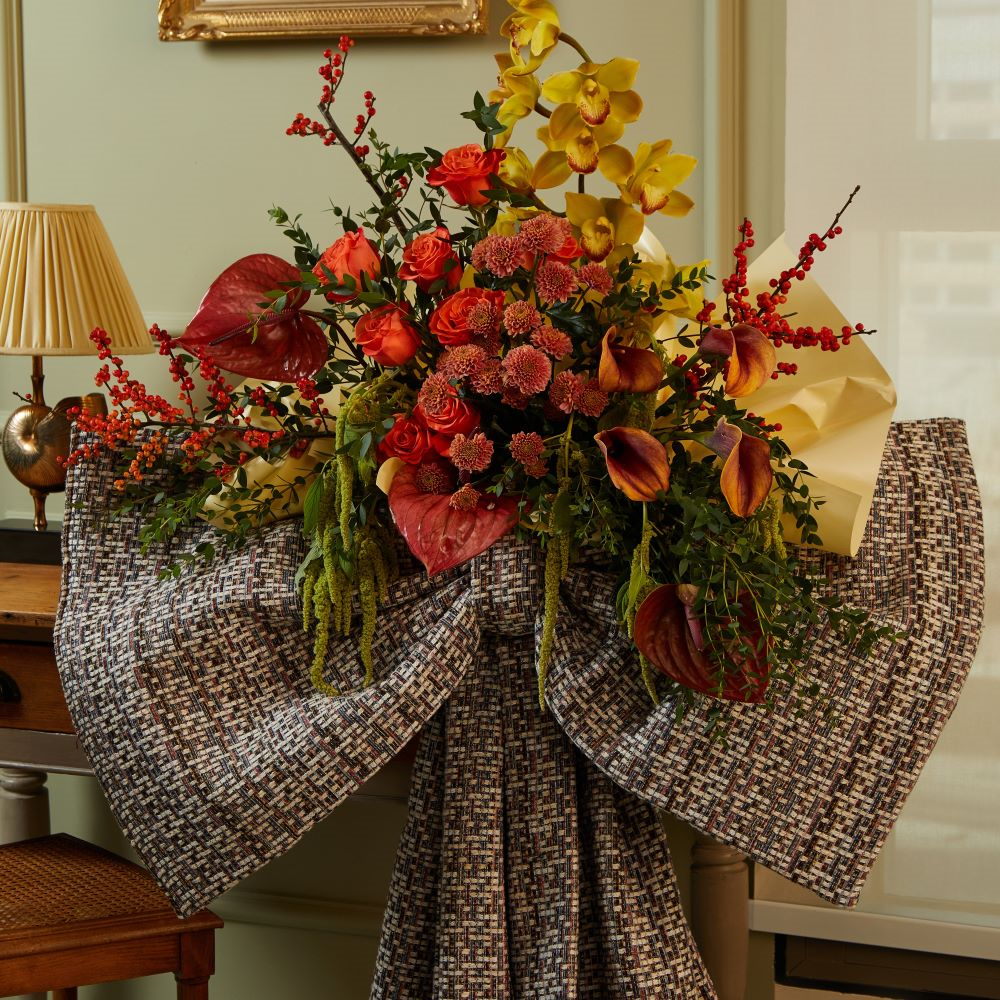 A winter ribbon wrapped around roses, orchids, chrysanthemums, calla lilies, and anthuriums.
