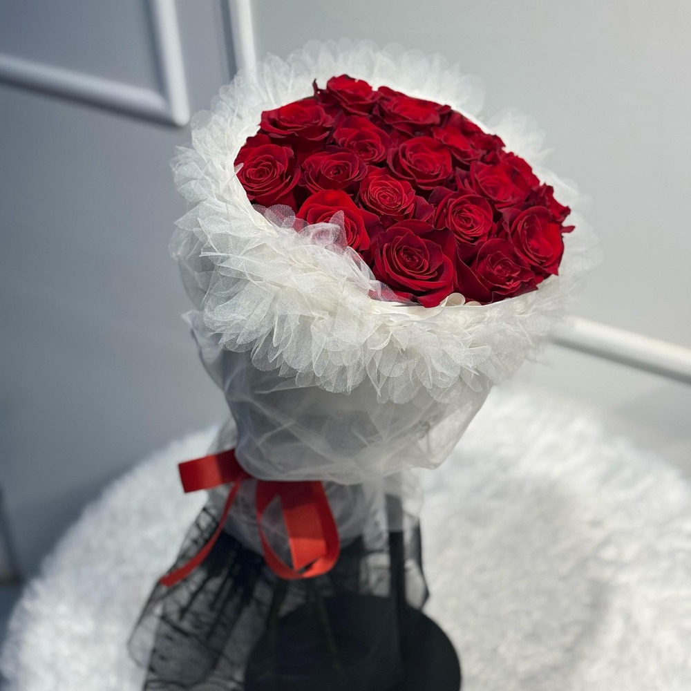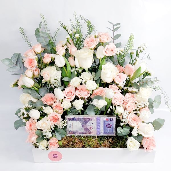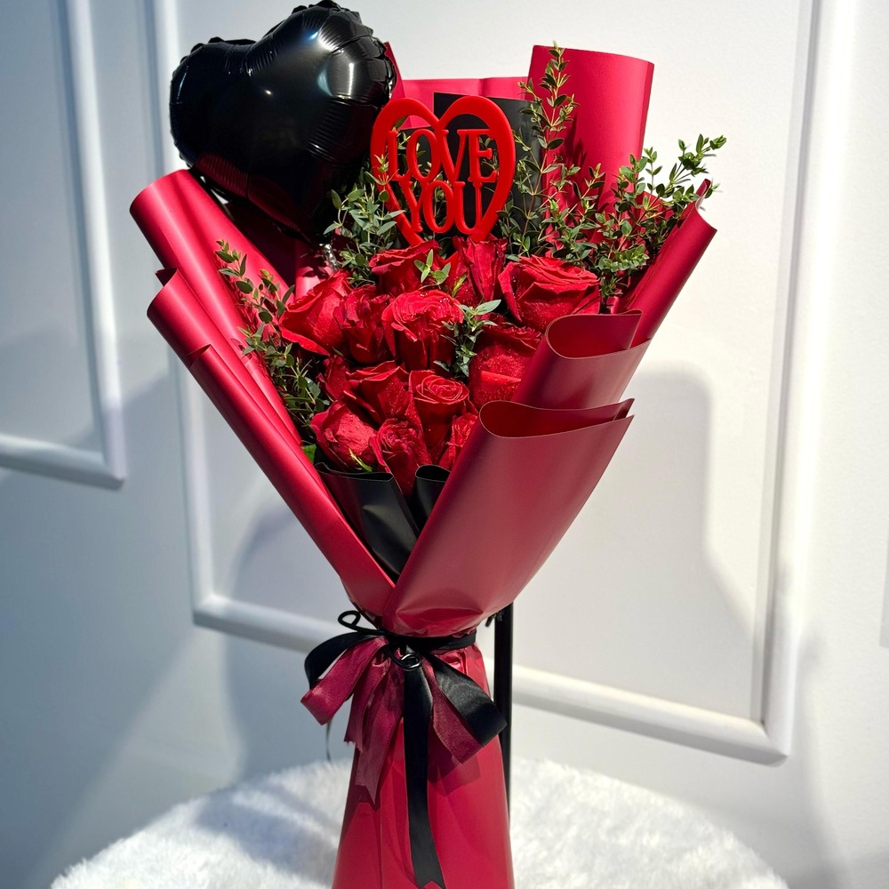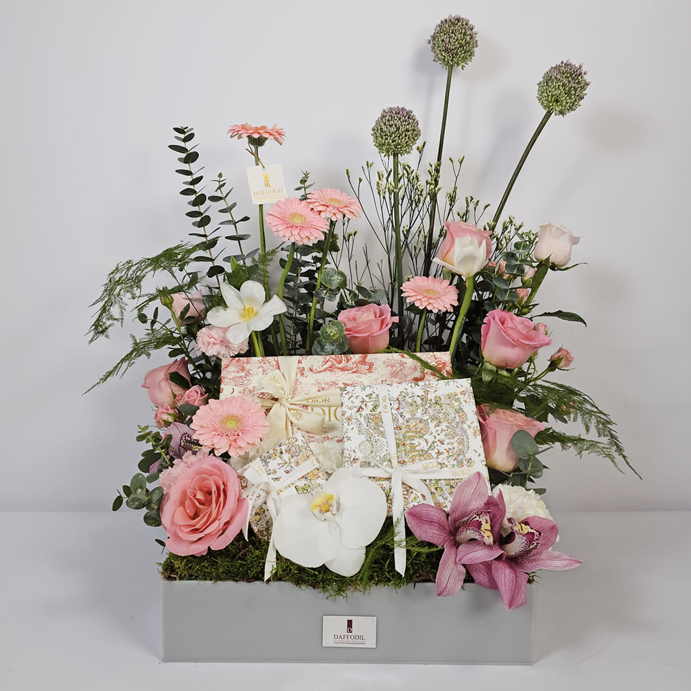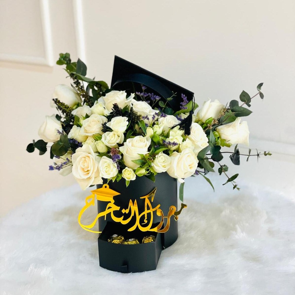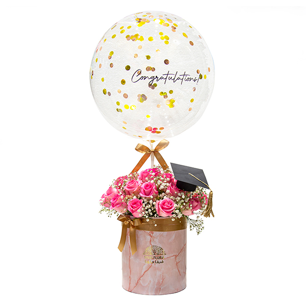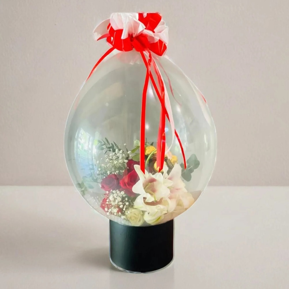 This transparent balloon filled with mixed flowers with a black box, it's a beautiful transparent balloon.