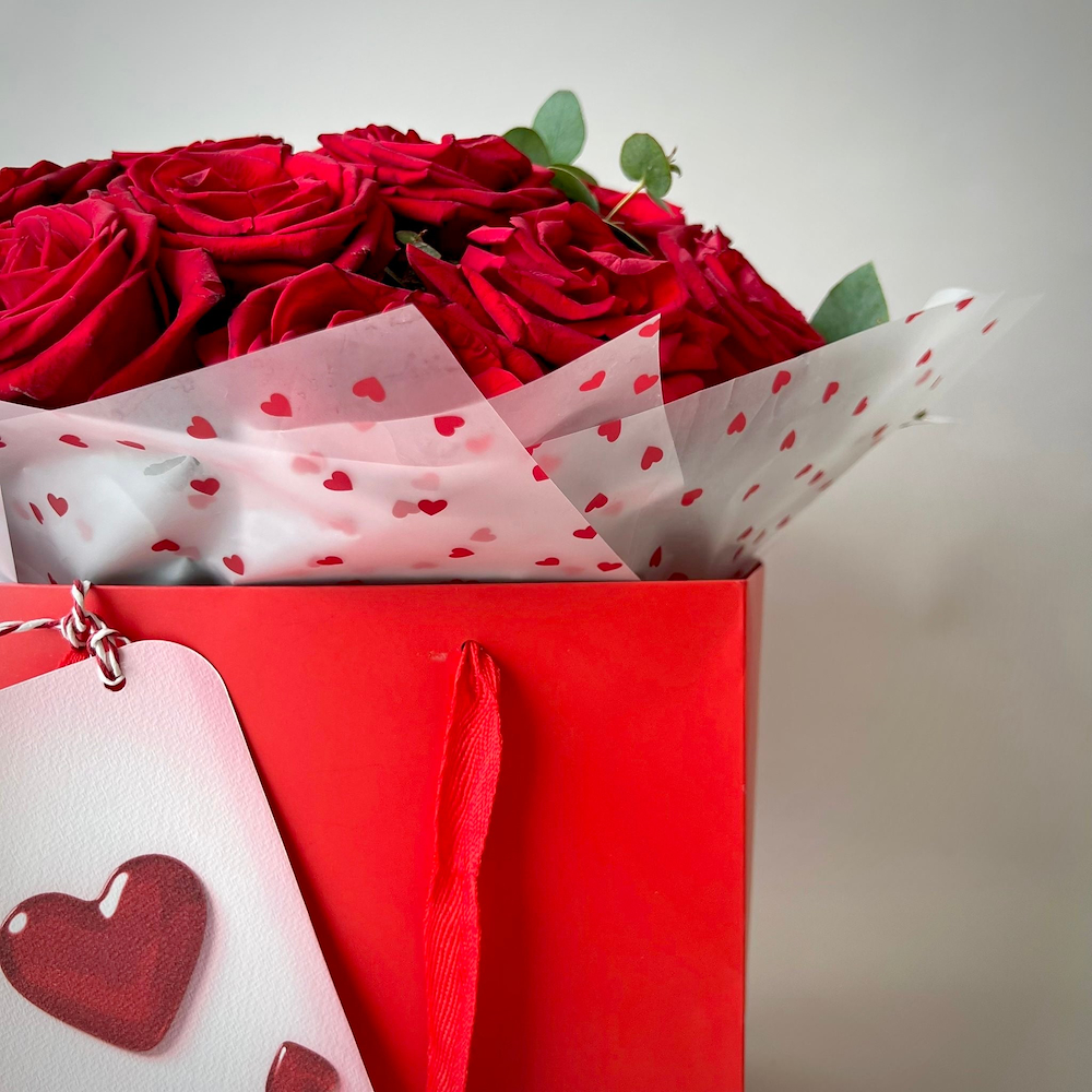 Red roses arranged inside a red paper bag with our in-house designed and heart greeting card.