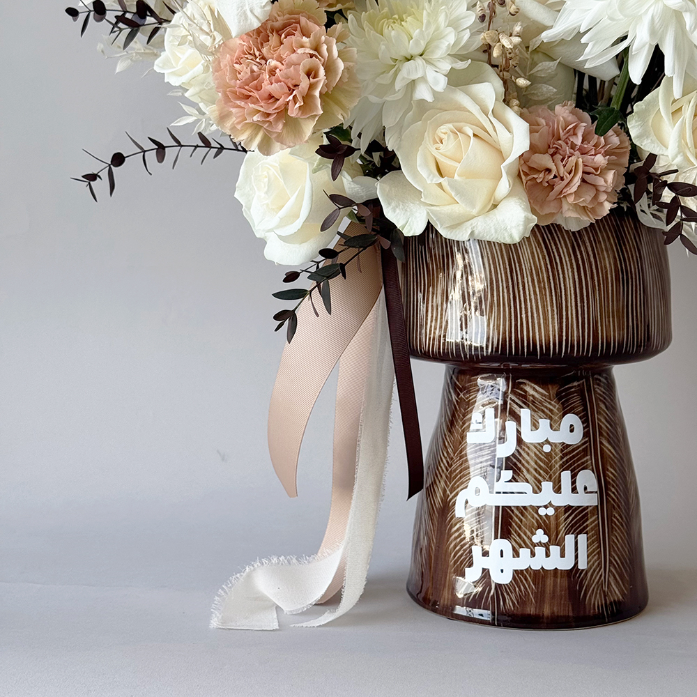 A bouquet containing roses, carnations, and chrysanthemums, arranged in a brown Ramadan pedestal vase.