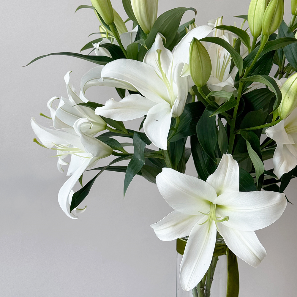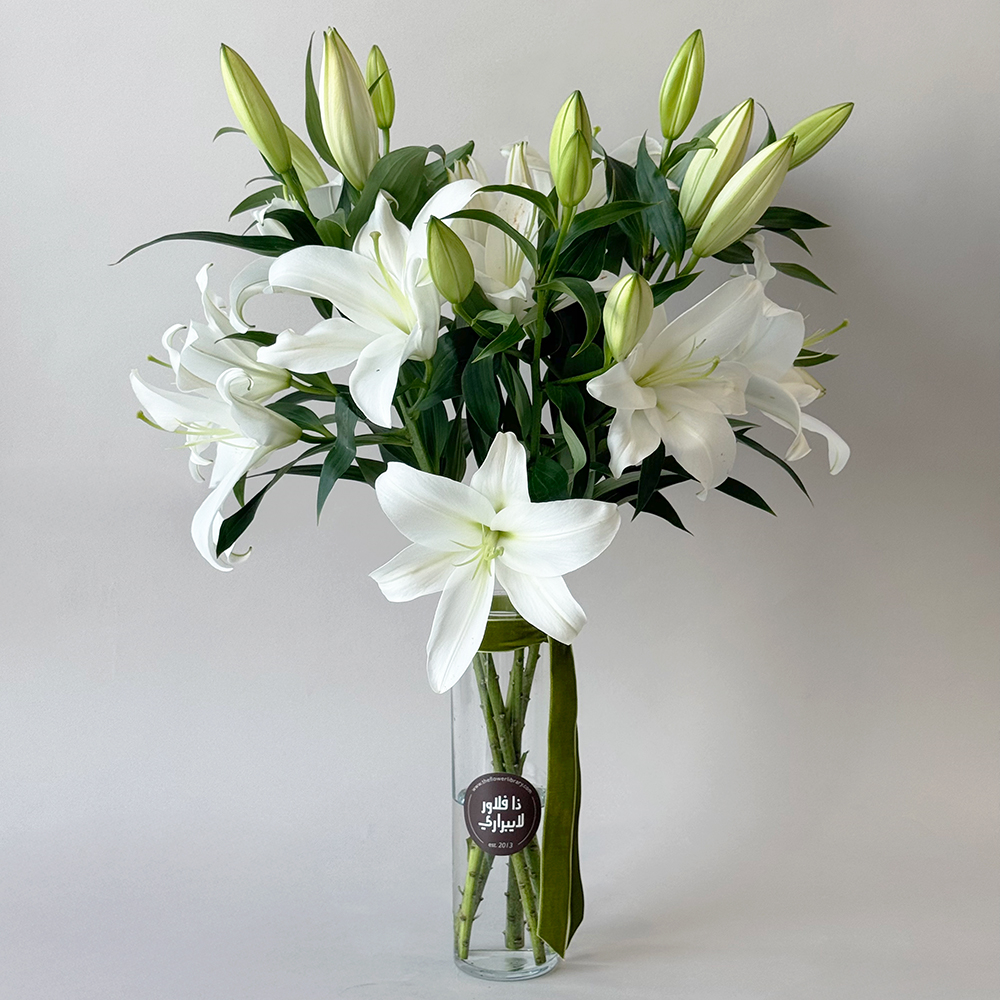 A bouquet of white lilies in our glass vase, with a touch of ribbons. Note: Lilies may arrive closed and not blooming, because they are new and fresh, and will start blooming the next day.