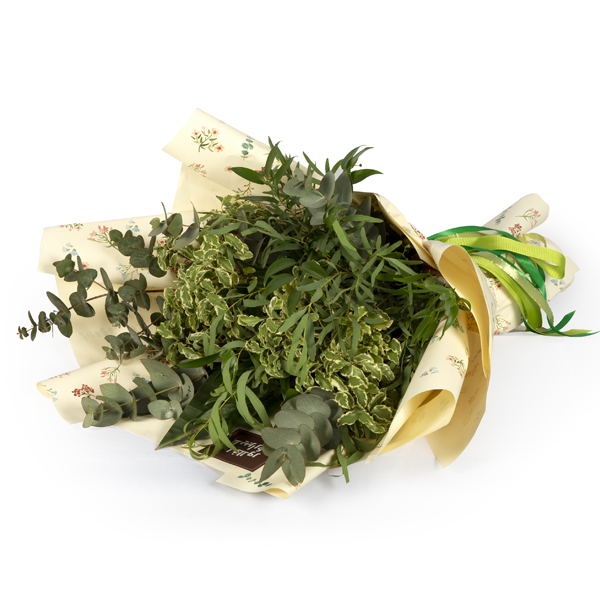 Mixed green leaves bouquet in Bab Mark wrapping paper.