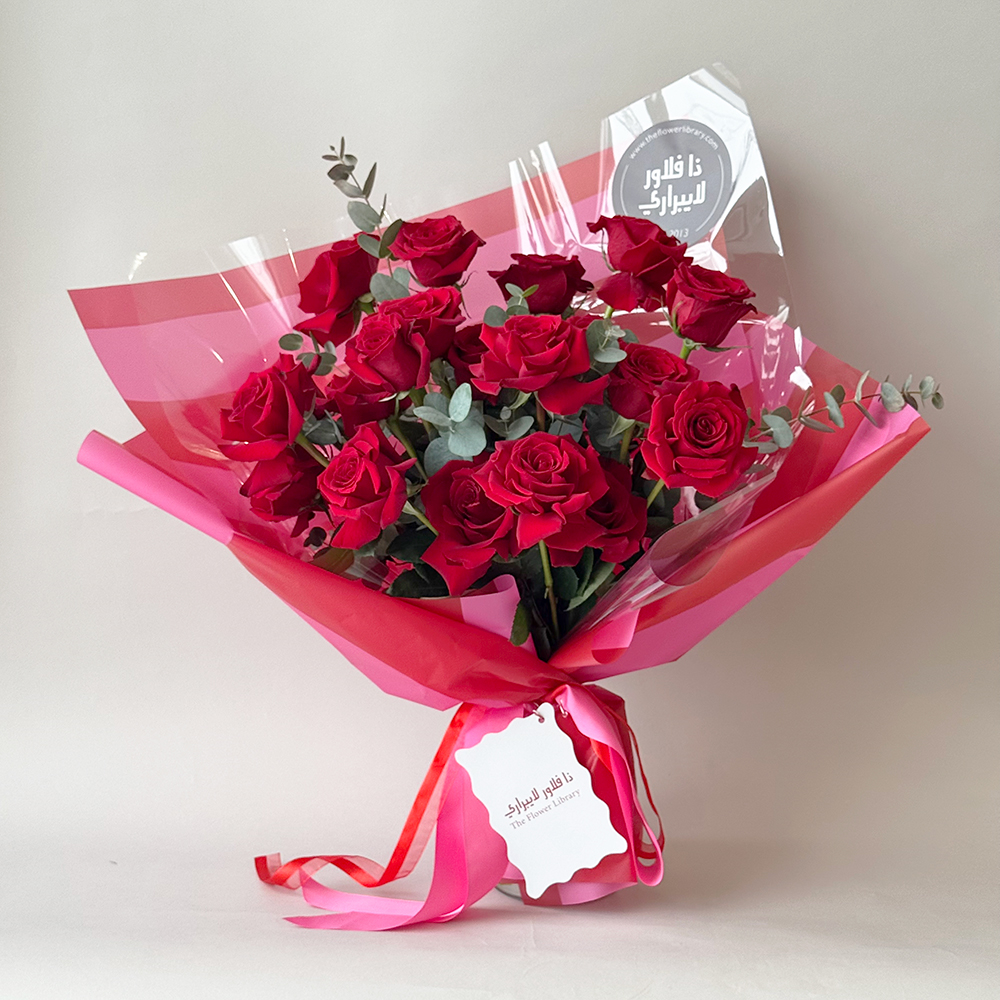 A hand bouquet of red roses, wrapped with our eco-friendly striped frosted paper.