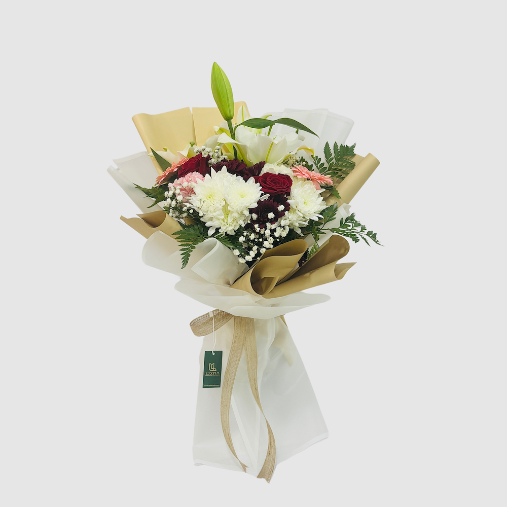 A hand bouquet that contains chrysanthemums, lilies, roses and gypsophila.