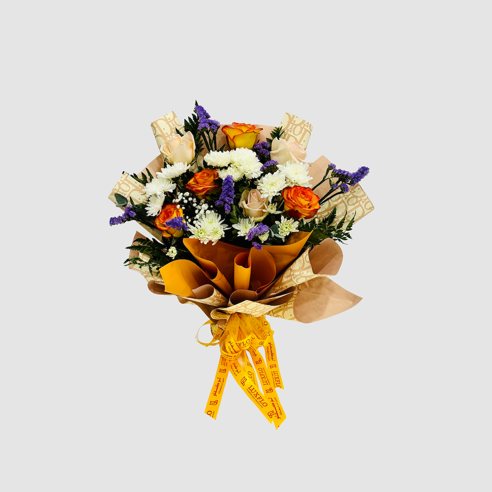 A bouquet featuring roses, statice and chrysanthemum flowers.