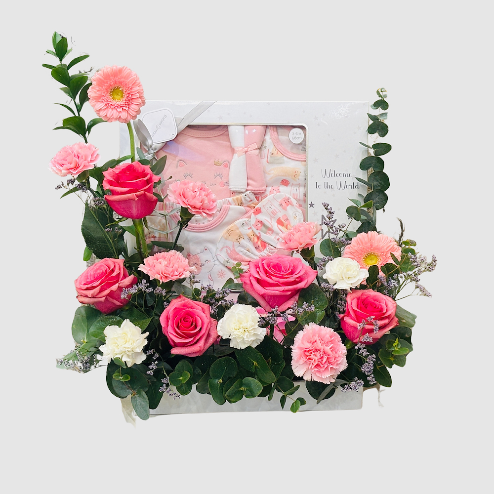 A lovely and thoughtful bouquet of pink roses, gerbera, carnations, eucalyptus, and ruscus leaves.