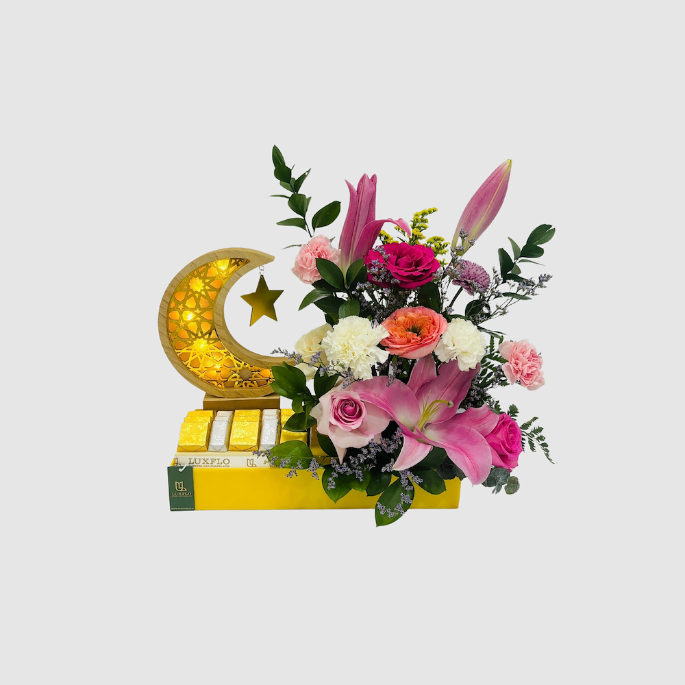 A box that contains roses, lilies and carnations along with chocolates.