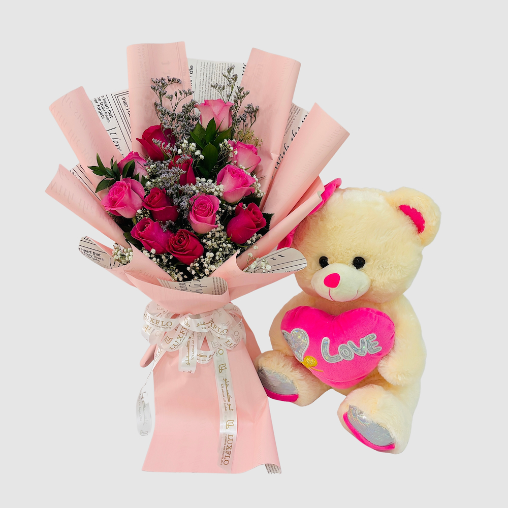 A bouquet featuring pink roses, ruscus leaves, and gypsophila flowers with a teddy bear.