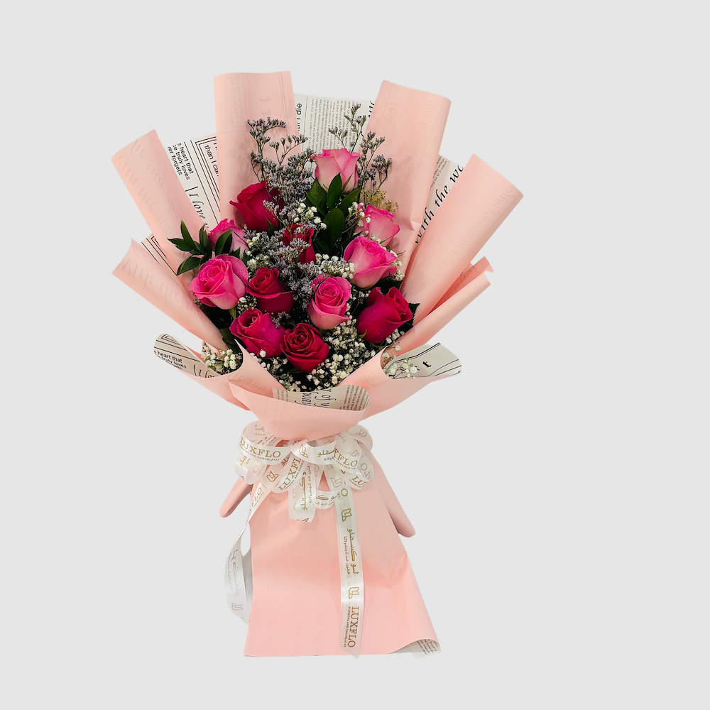 A bouquet featuring pink roses and gypsophila flowers with a special wrapping.