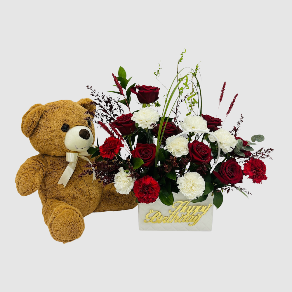 An elegant bag featuring roses, carnation, and ruscus leaves with a happy birthday topper and a teddy bear.