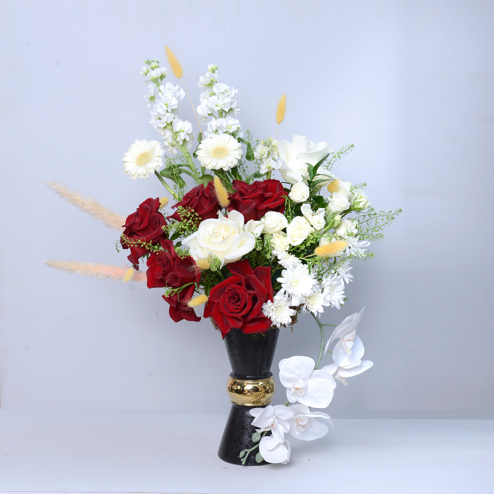 A bouquet containing roses, baby roses, chrysanthemums, matthiola, and gerberas, arranged beautifully in a vase.