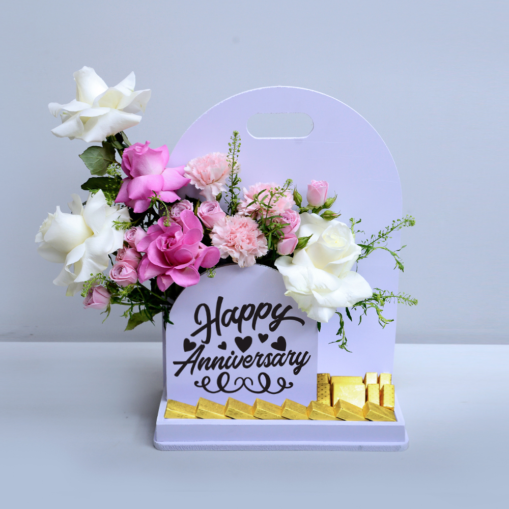 A bouquet containing roses, baby roses, gerberas, and carnations, arranged beautifully in a stand with 320g of chocolates.