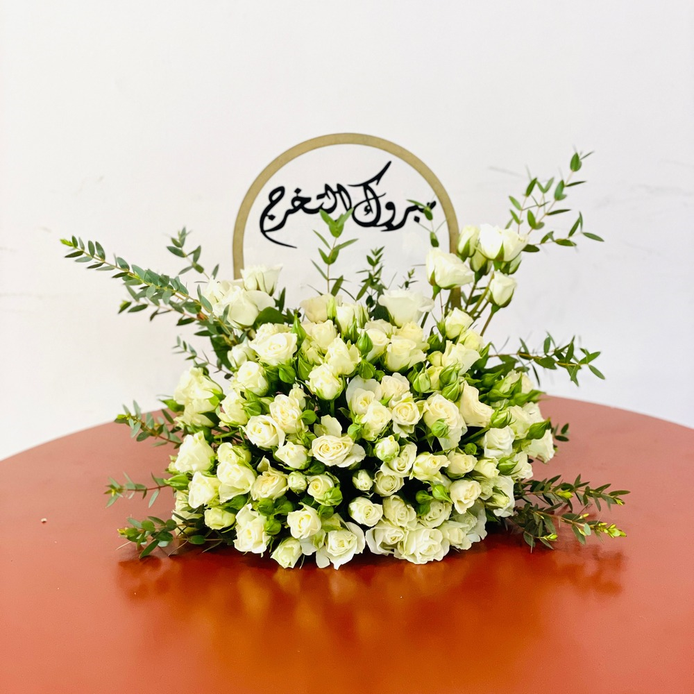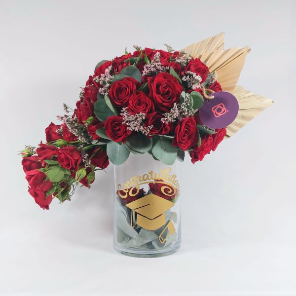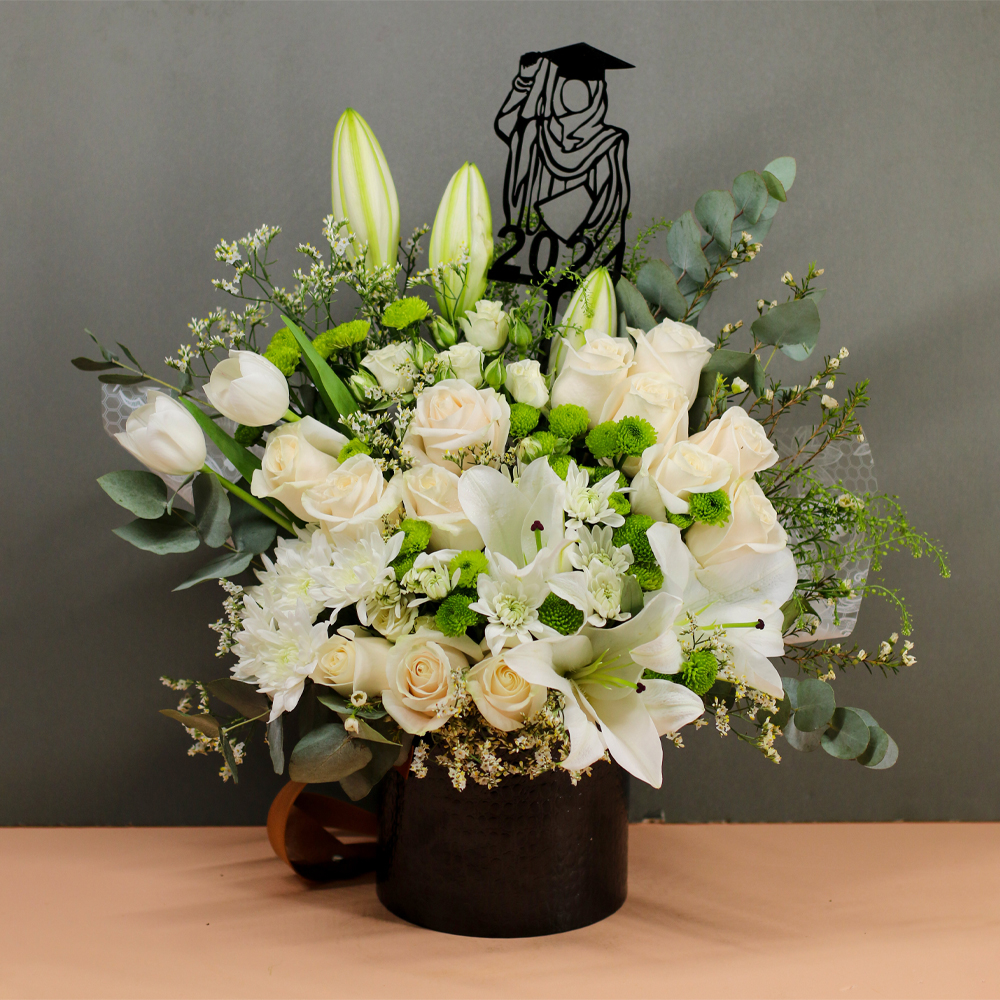 A bouquet containing roses, baby roses, carnations, chrysanthemums, and lilies arranged beautifully in a stand with a pen.