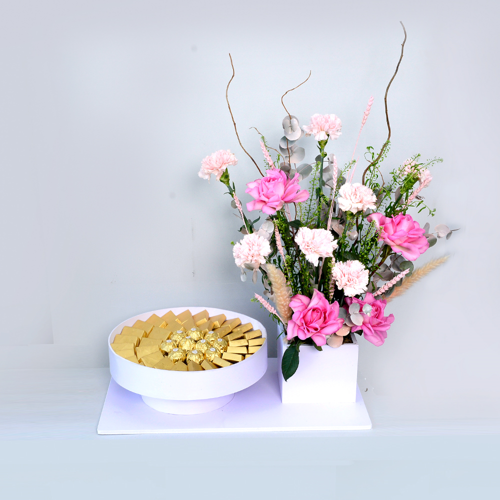 A charming mix of 4 pink roses, 6 carnations, and dry flowers paired with 1 kg of chocolate.