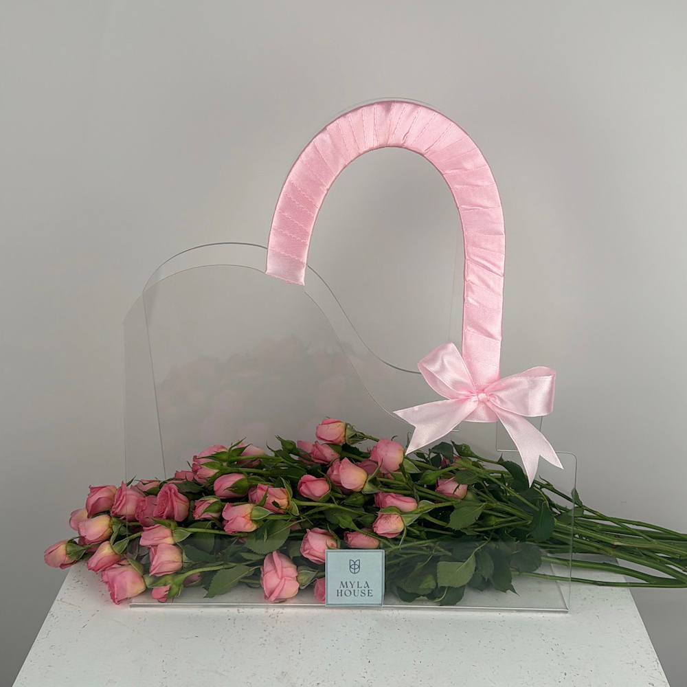 A pink rose arrangement in a clear tote with satin ribbon, featuring a stylish and modern design.