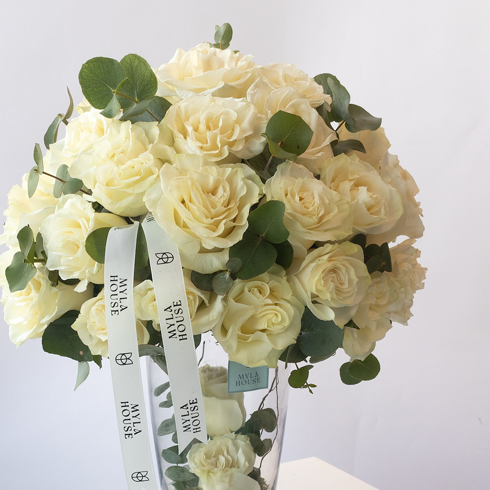 A luxurious glass vase arrangement filled with white roses and eucalyptus touches, perfect for elegant gifting and special occasions.