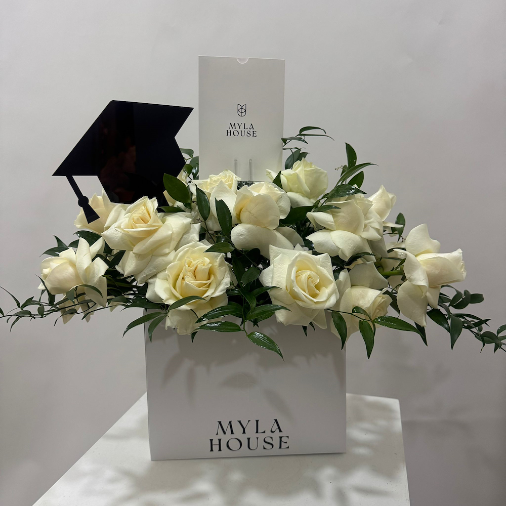 A hand tied bouquet of red roses wrapped in white paper with a satin ribbon, an elegant gesture of love.
