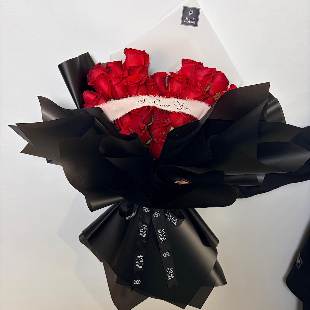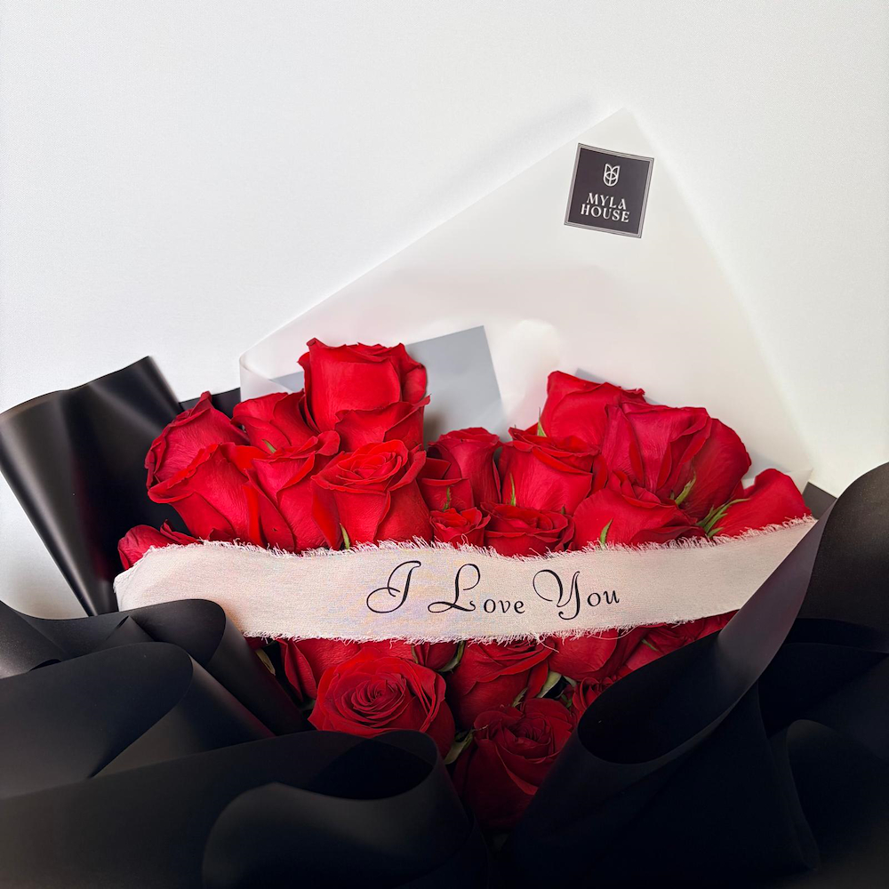 A luxurious red rose bouquet wrapped in an elegant design with a romantic message. Perfect for expressing feelings and gifting.