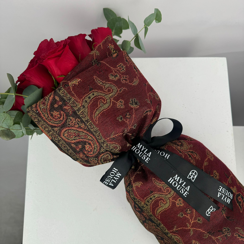 A hand bouquet containing red roses, wrapped beautifully in a red scarf.