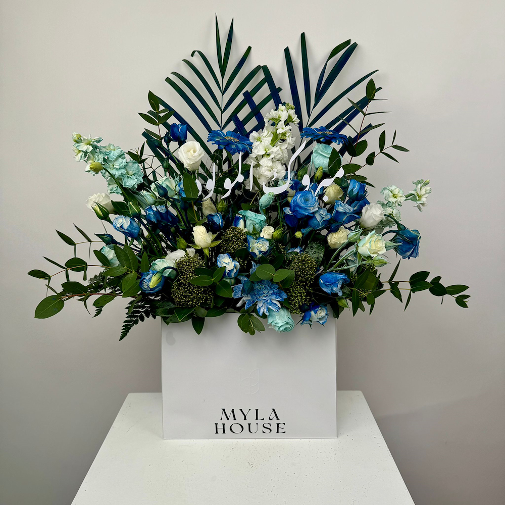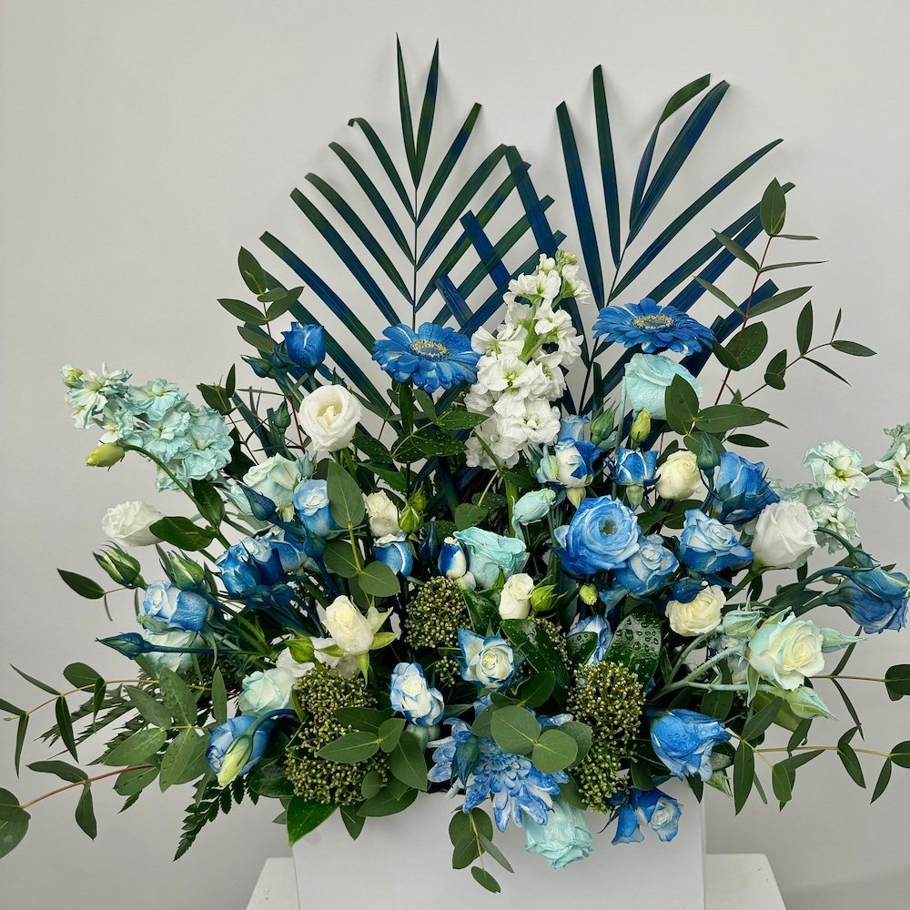 A unique flower arrangement in shades of blue and white with elegant green touches.